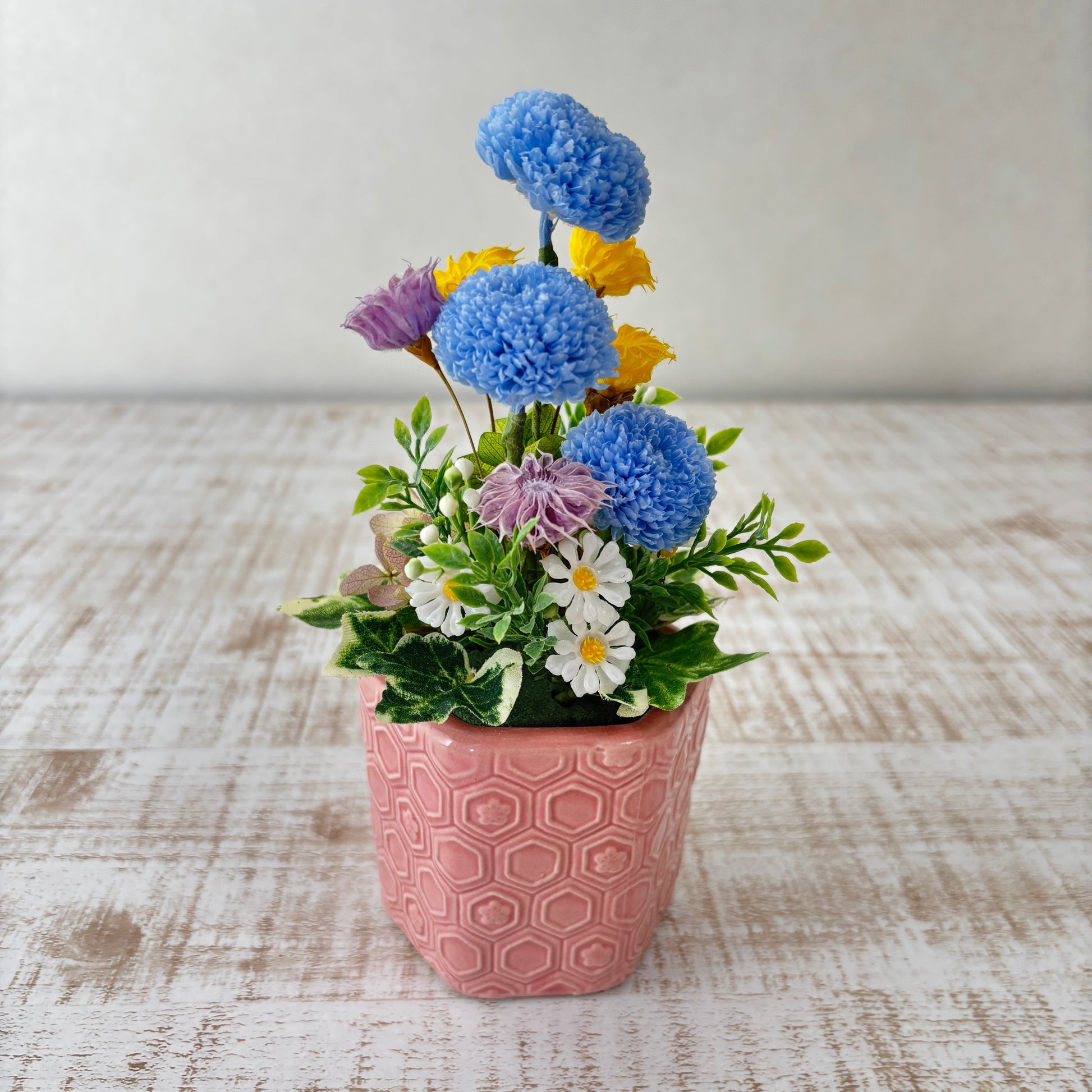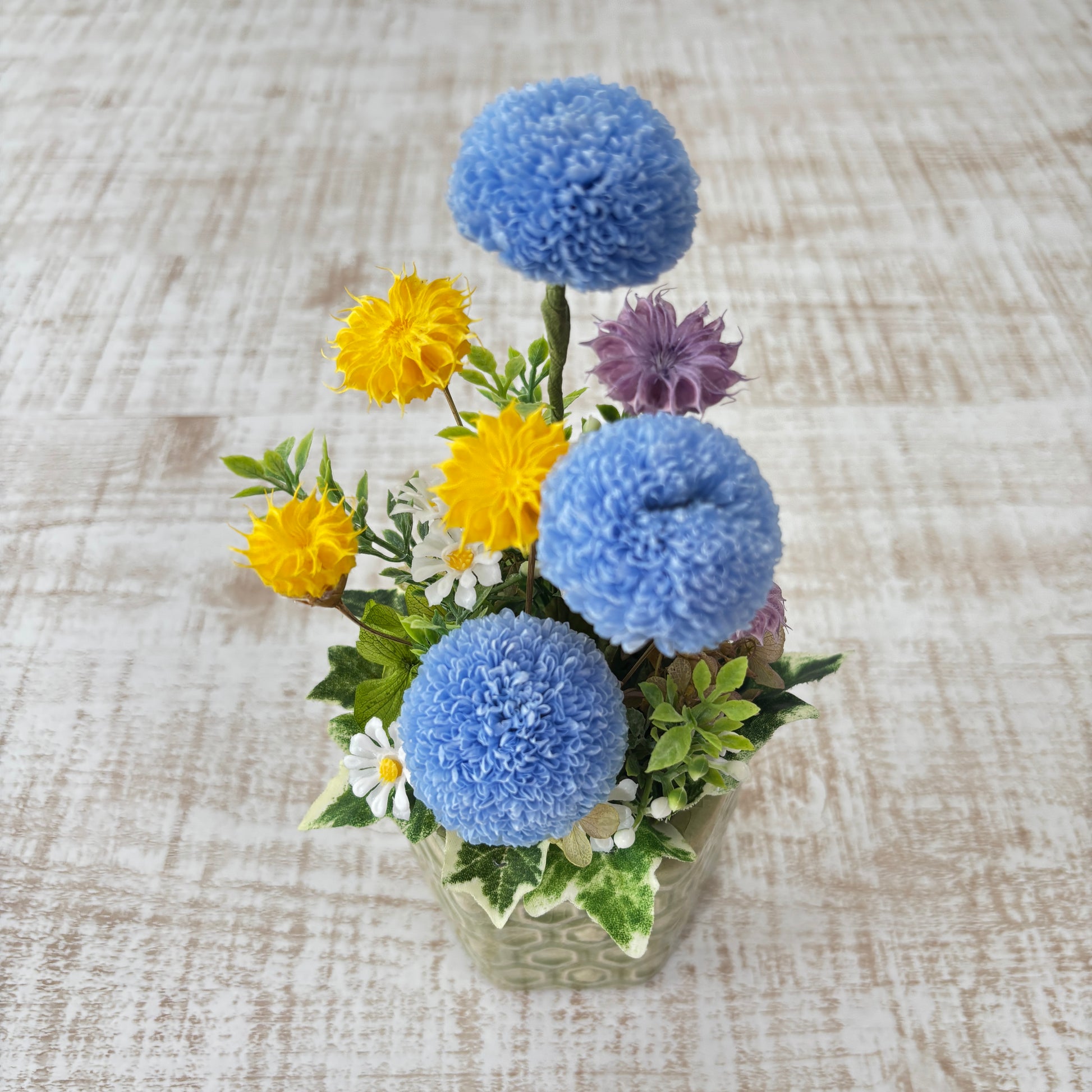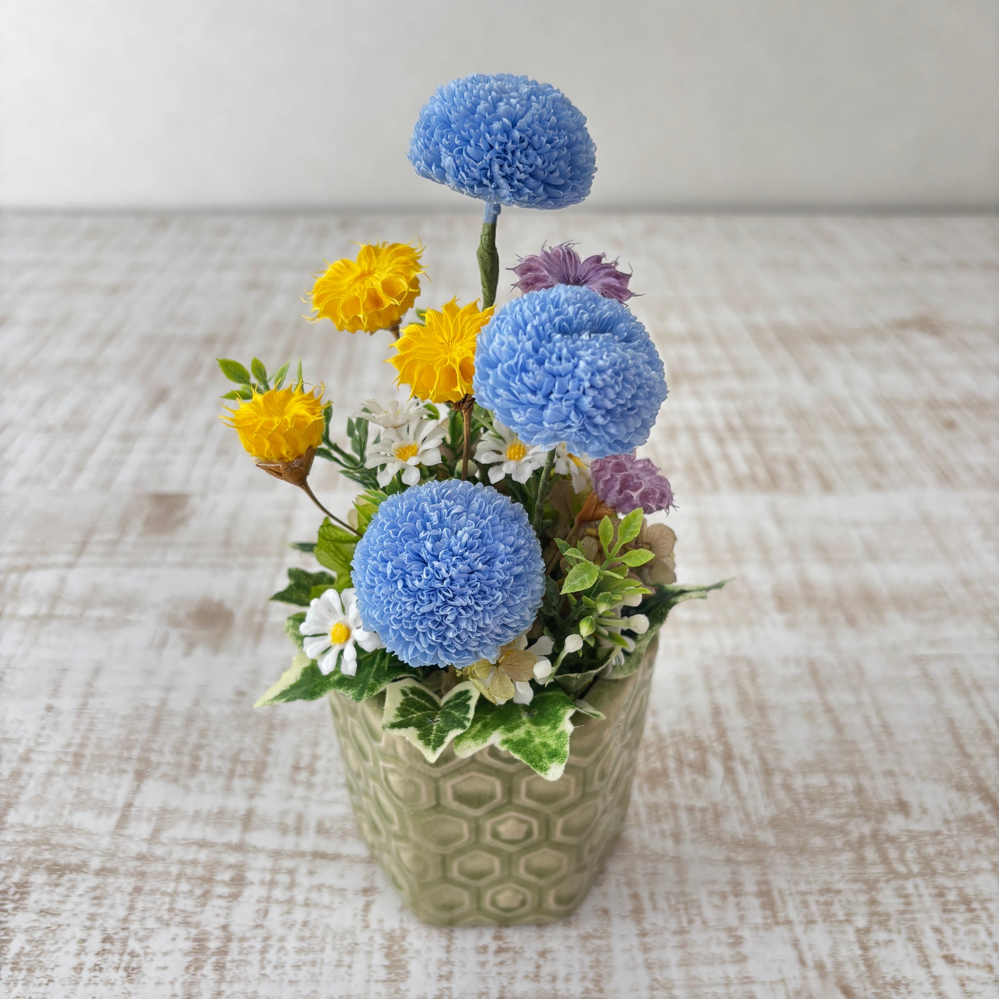岡山市の花屋「ブルーメンノイエ」がお届けする、ブルー系を基調とした爽やかなプリザーブドフラワーアレンジです。上品な薄ピンクやグリーンの器に映える花々が、涼やかで洗練された印象を演出します。仏壇の中へ飾るお供え花におすすめです。お手入れ不要で、長く美しい状態を保てます。