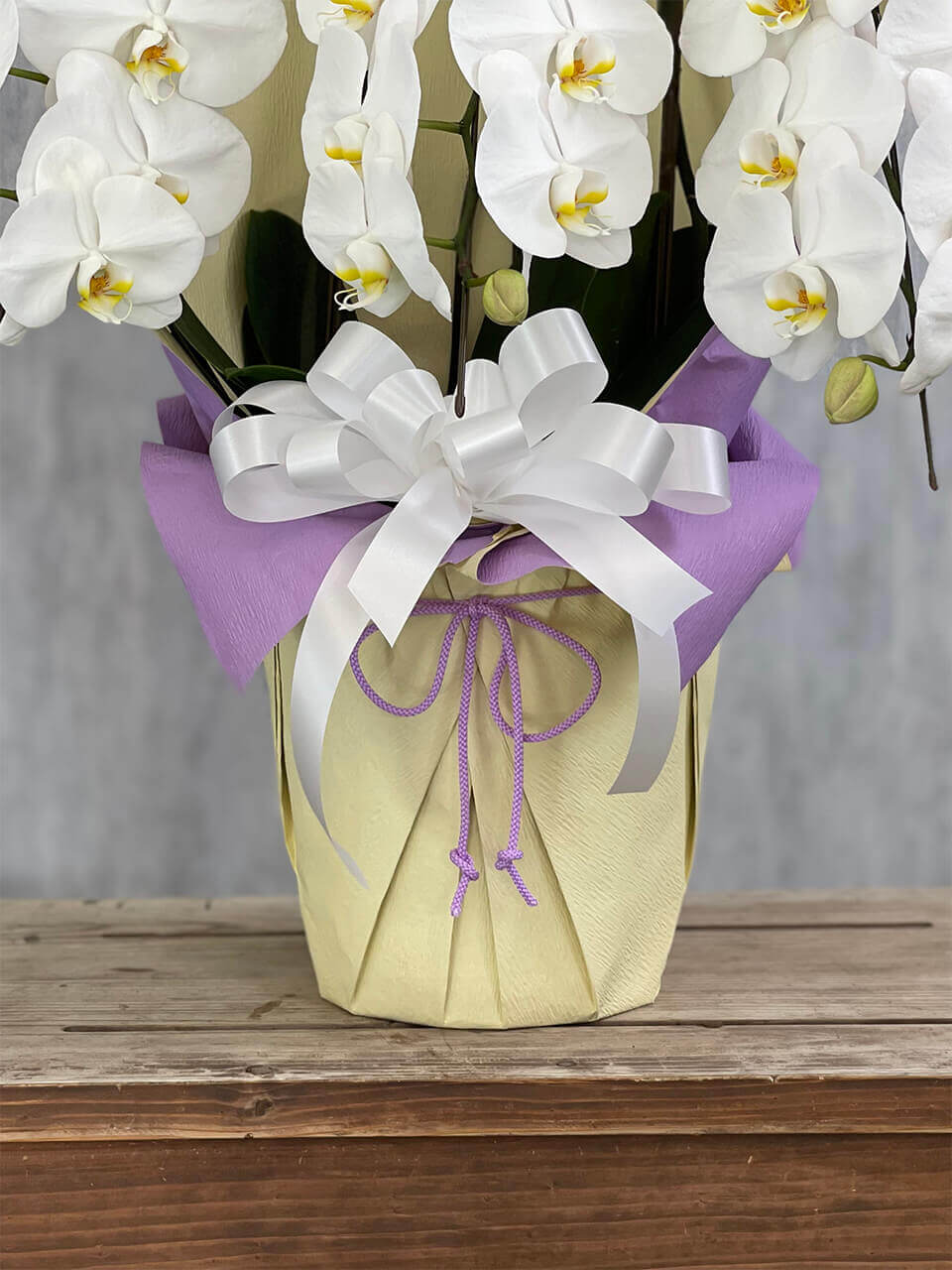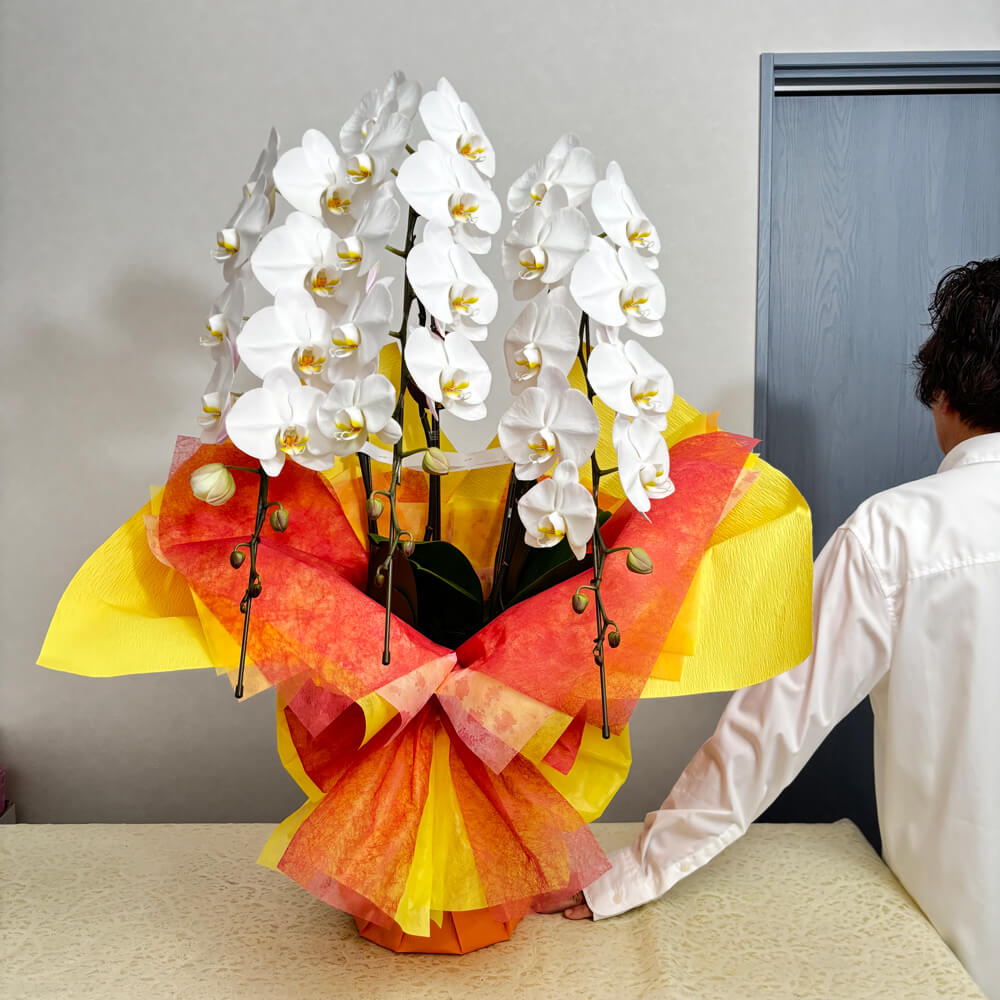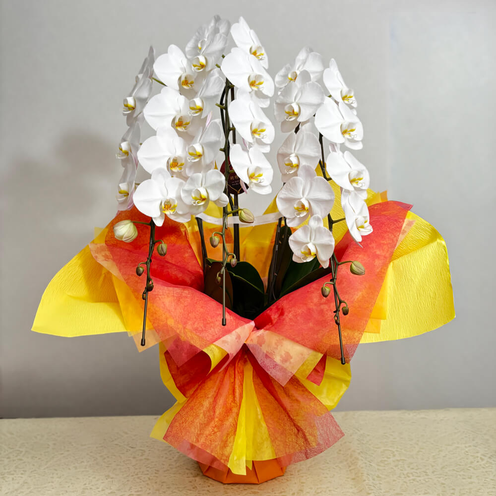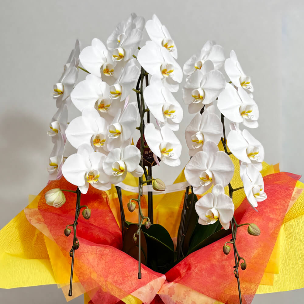 岡山市の花屋「ブルーメンノイエ」がお届けする、気品あふれる3本立ちの白胡蝶蘭です。純白の花が優美に連なり、高級感と華やかさを兼ね備えた一品。開店祝いや就任祝い、特別なギフトとして大変おすすめです。