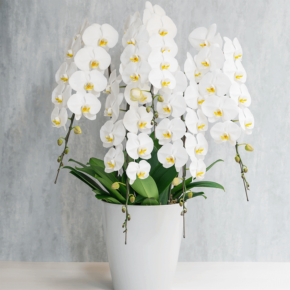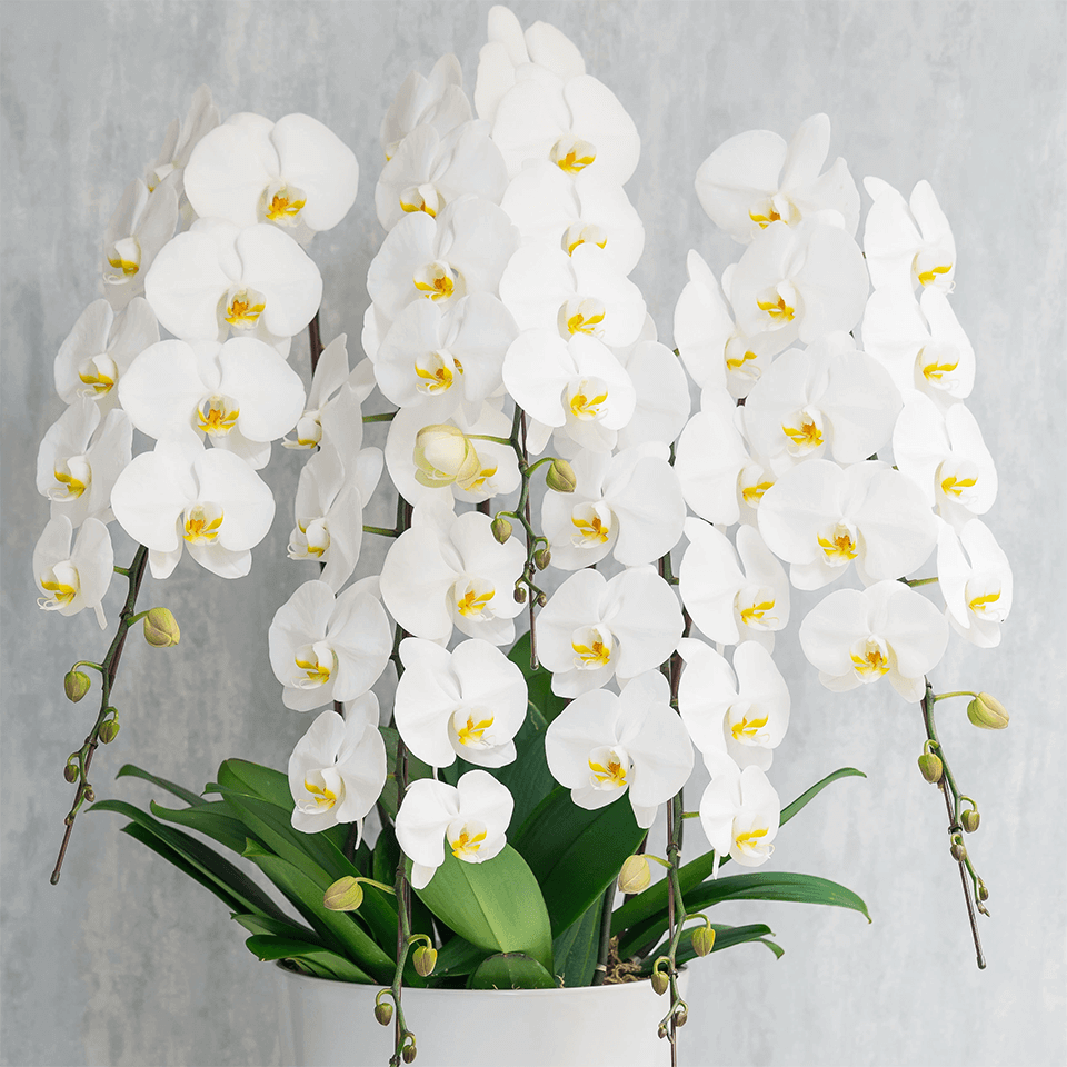 岡山市の花屋「ブルーメンノイエ」がお届けする、気品あふれる5本立ちの白胡蝶蘭です。純白の花が優美に連なり、高級感と華やかさを兼ね備えた一品。開店祝いや就任祝い、特別なギフトとして大変おすすめです。