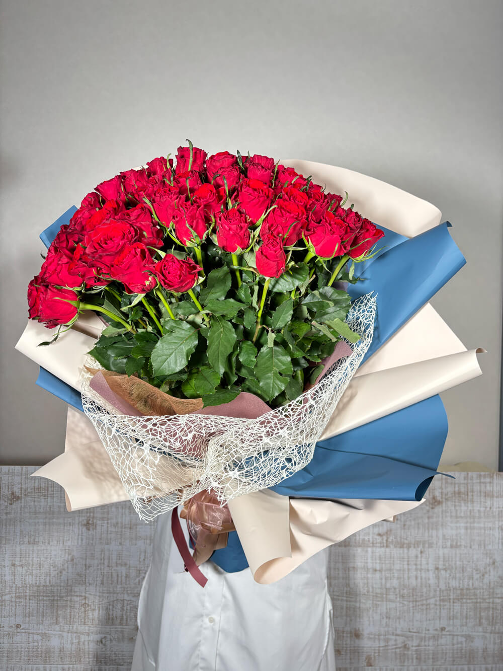 岡山市の花屋「ブルーメンノイエ」がお届けする、赤い花を50本束ねた特別な花束です。赤い花の花言葉は「愛情」や「情熱」、そして50本の花束には「永遠(いつまでも変わらぬ愛)」という想いが込められています。大切な記念日やプロポーズにふさわしい、心に残る贈り物です。生花を使用しており、季節により旬の花材で制作するため、写真の花材と異なる場合がございます。