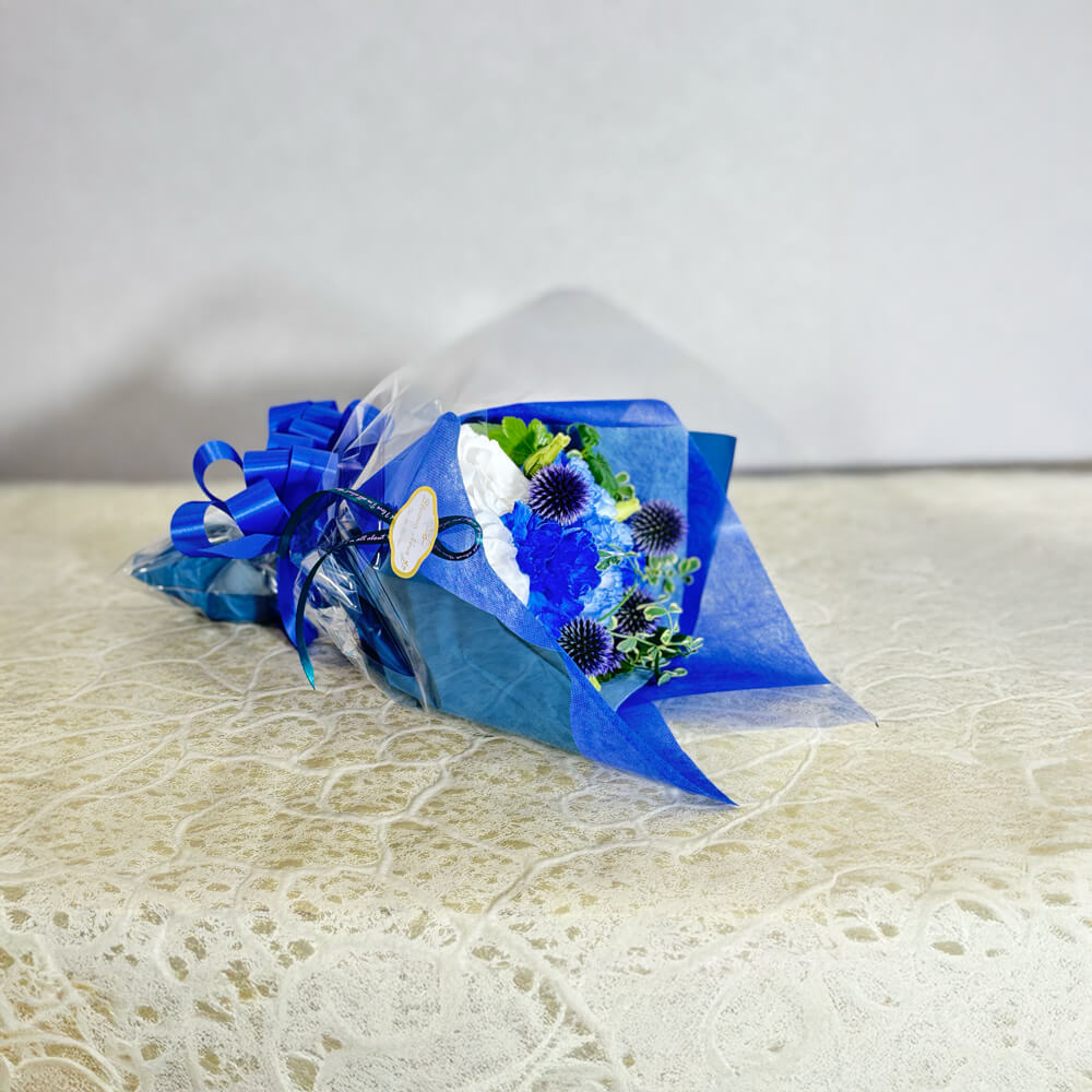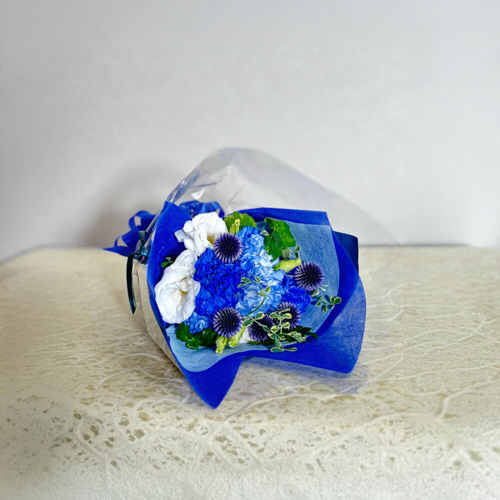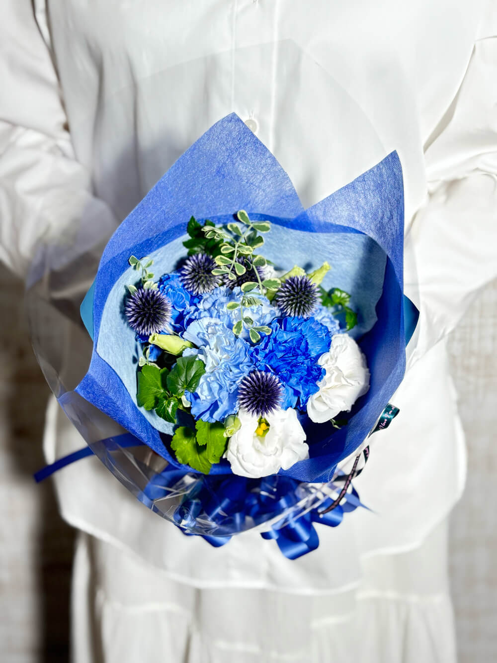 岡山市の花屋「ブルーメンノイエ」が心を込めてお作りする、水色と青の花束です。爽やかで上品な色合いが、特別な日の贈り物やお祝いにぴったり。季節ごとの旬の生花を使い、その時期ならではの美しさをお届けします。そのため、掲載写真と実際の花材が異なる場合がございます。どうぞ世界にひとつだけの花束をお楽しみください。