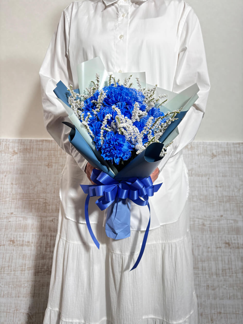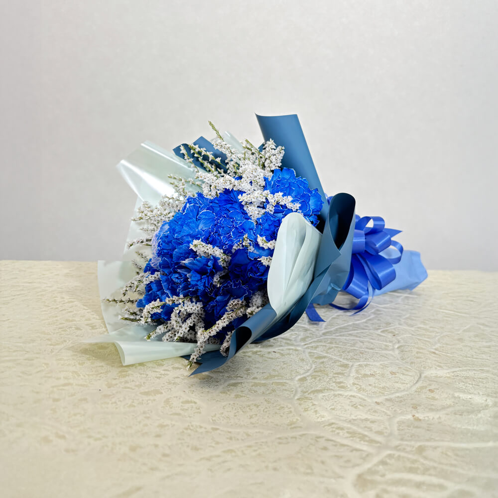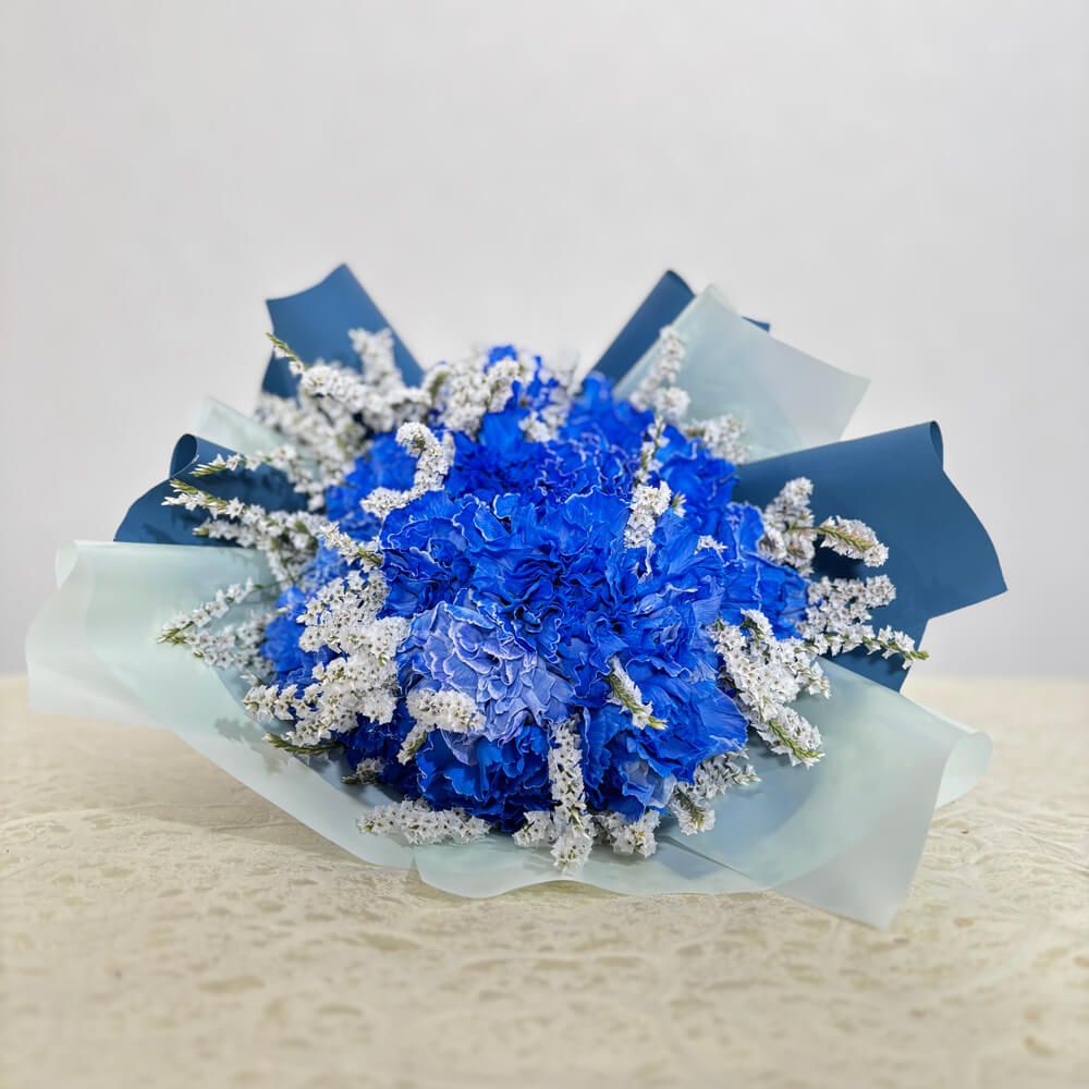 岡山市の花屋「ブルーメンノイエ」がお届けする、鮮やかなブルー系でまとめた花束です。凛とした美しさと爽やかさを兼ね備えた印象的なカラーは、特別な日の贈り物やサプライズに最適です。スタイリッシュなラッピングで、男女問わず喜ばれるデザインに仕上げました。生花を使用しており、季節に応じて旬の花材を取り入れるため、写真と異なる場合がございます。