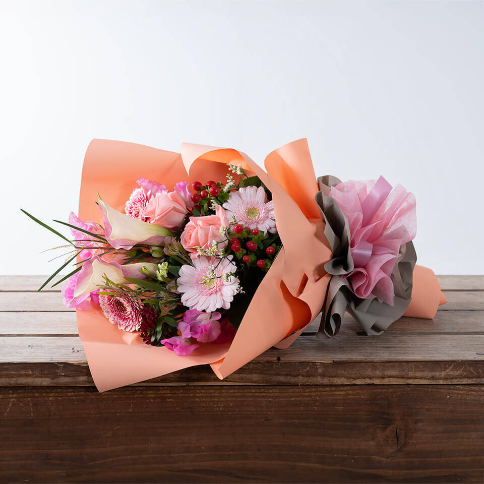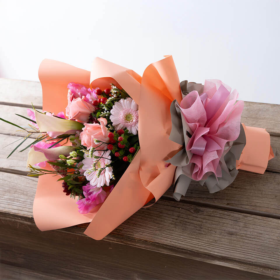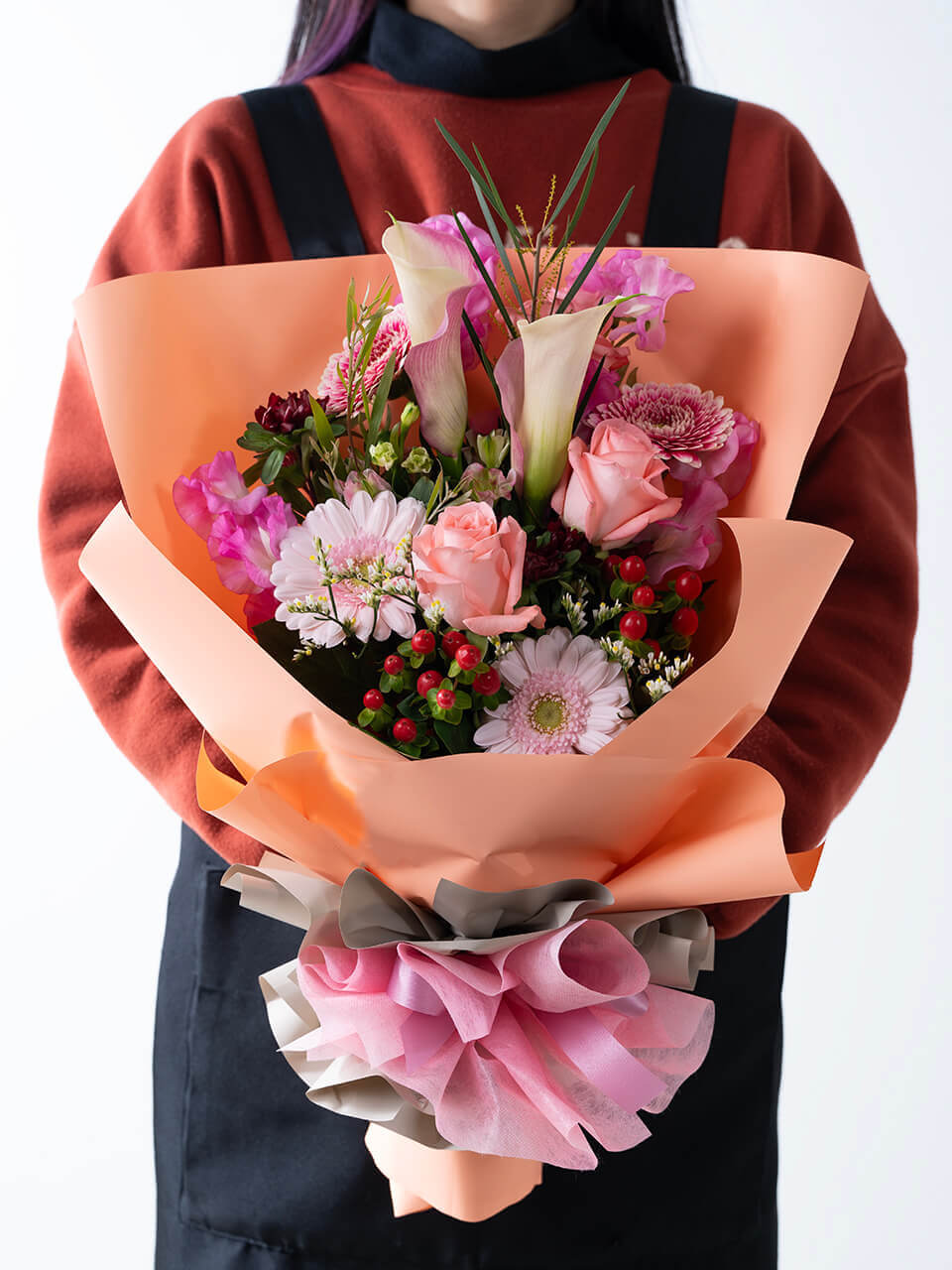 やさしく可愛らしいピンク系を基調に、韓国風のふんわりとしたラッピングで仕上げたドレスブーケ。華やかさの中に上品さもあり、誕生日や記念日、送別や感謝の気持ちを伝える贈り物におすすめです。写真映えするデザインで、特別な瞬間を彩ります。