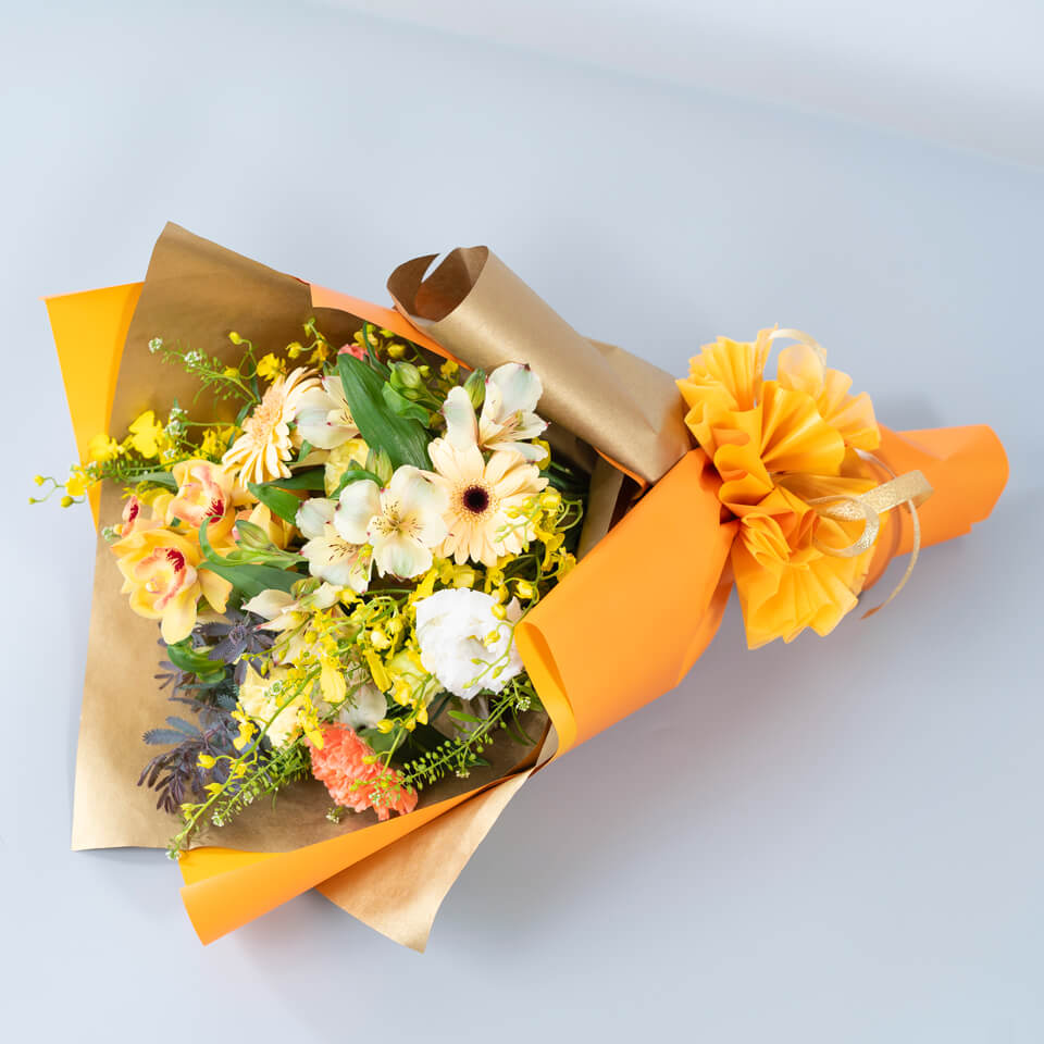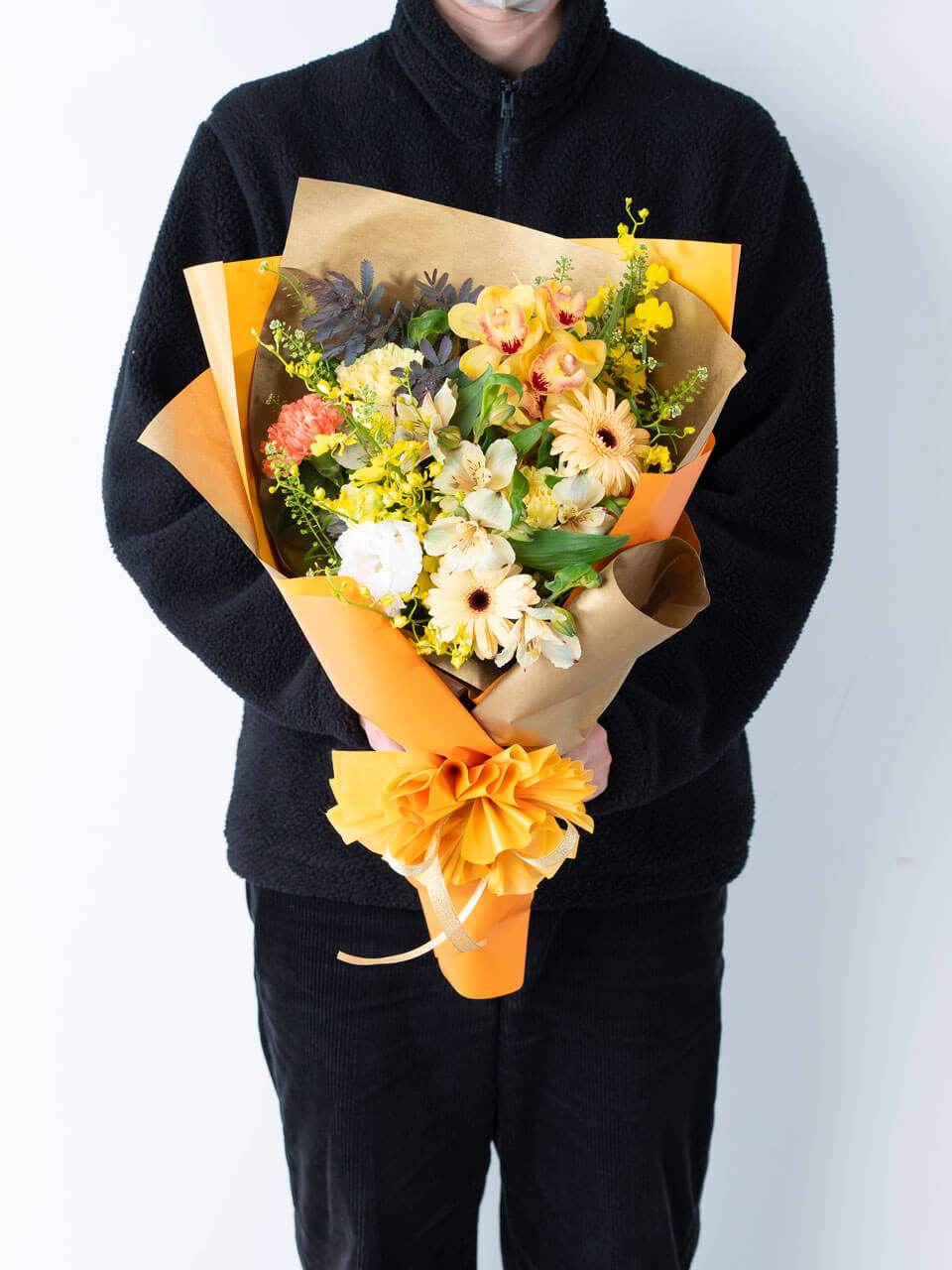 明るく華やかな黄色系を基調に、韓国風のトレンド感あるラッピングで仕上げたドレスブーケ。写真映えするデザインで、誕生日や発表会、ちょっとしたお祝いにもおすすめです。