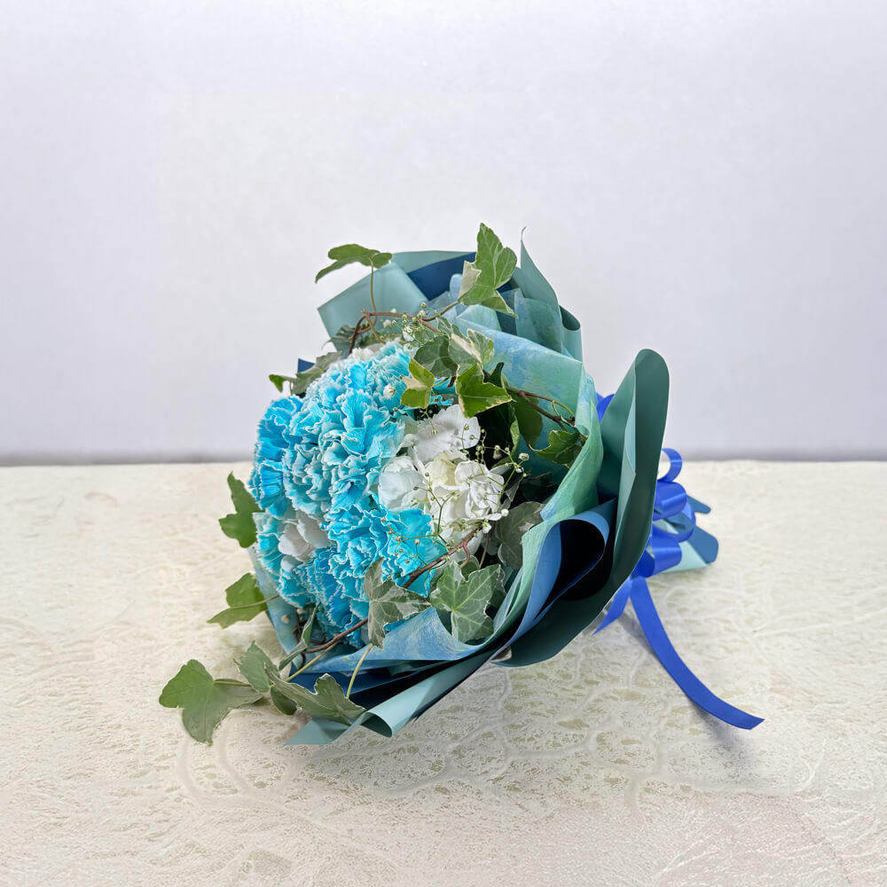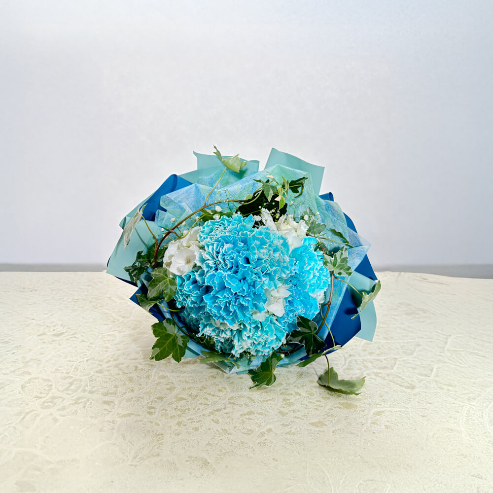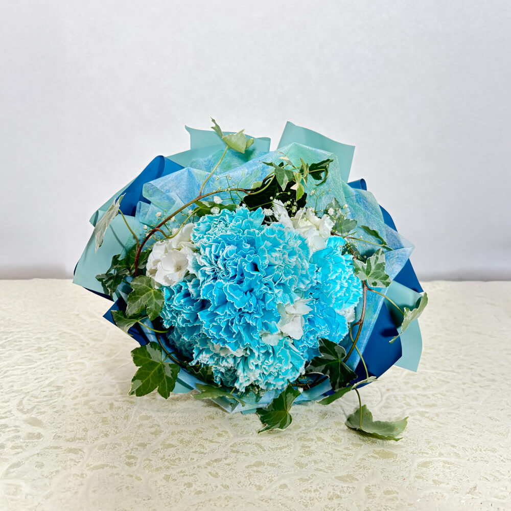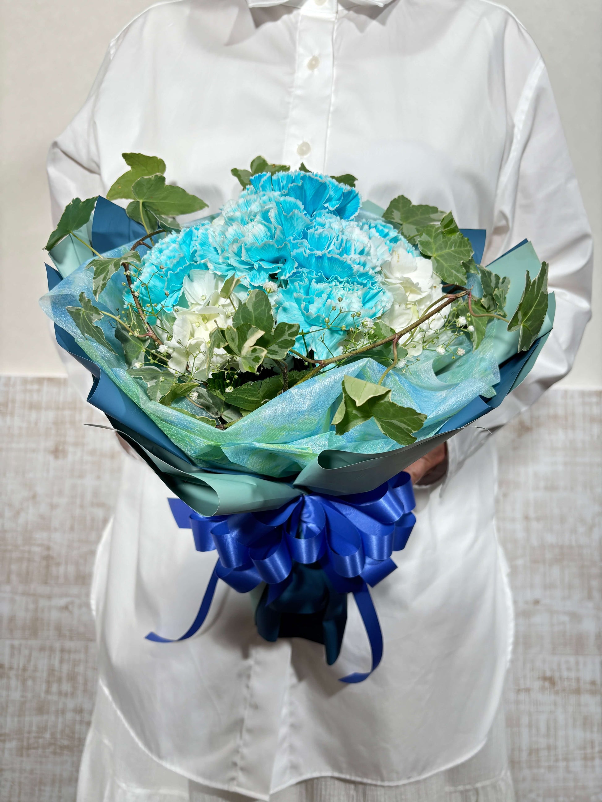 岡山市の花屋「ブルーメンノイエ」がお届けする、水色のカーネーションを使った爽やかな花束です。涼しげな色合いが魅力で、男性への贈り物や特別な記念日、お祝いシーンにもぴったり。落ち着いた雰囲気の中にも華やかさを感じさせる一品です。生花を使用しているため、季節により写真と異なる花材になる場合がございます。