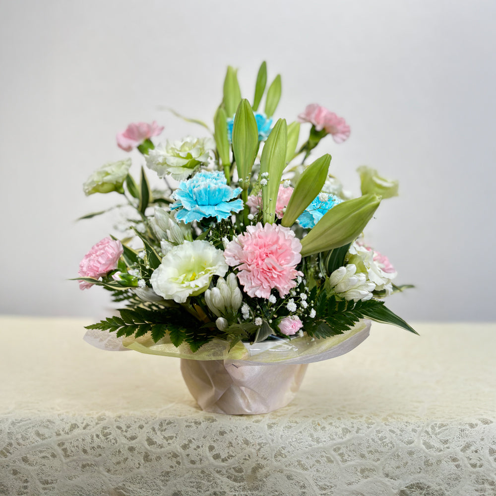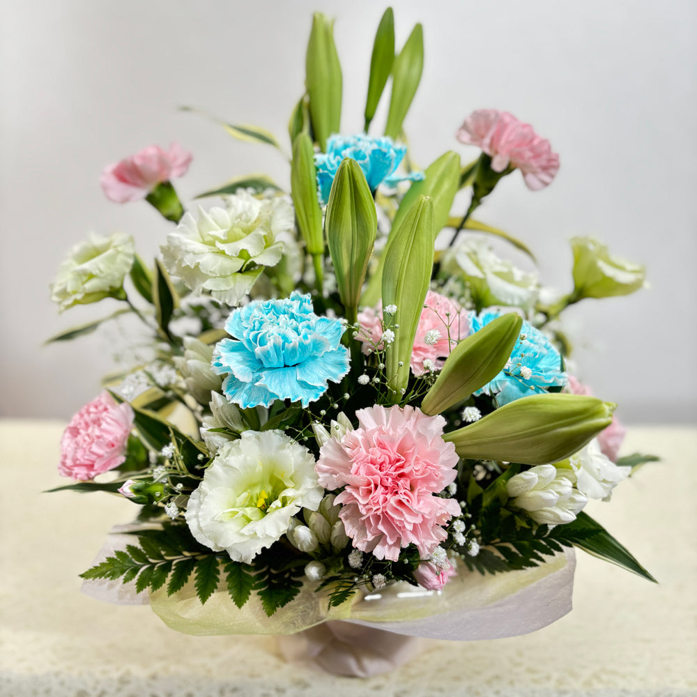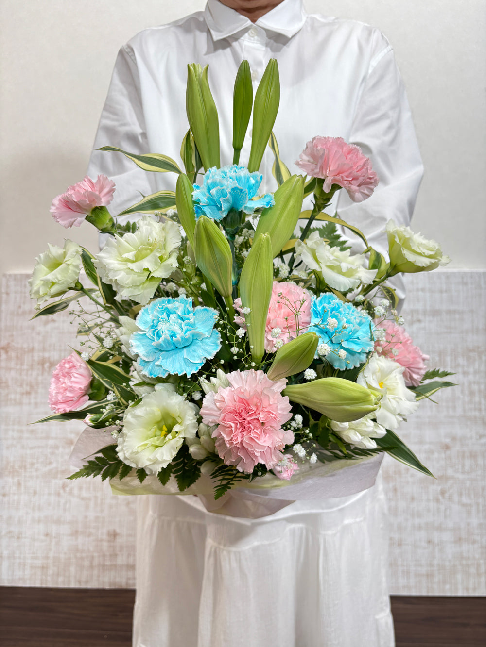 岡山市の花屋「ブルーメンノイエ」がお届けする、水色とピンクを基調とした優しい印象のお供え用アレンジメントです。柔らかな色合いの花々が、故人を偲ぶ気持ちにそっと寄り添います。ご命日や法要、ご自宅へのお供えにも適した上品なデザインです。生花を使用しているため、季節により写真と異なる花材になる場合がございます。