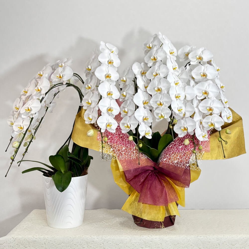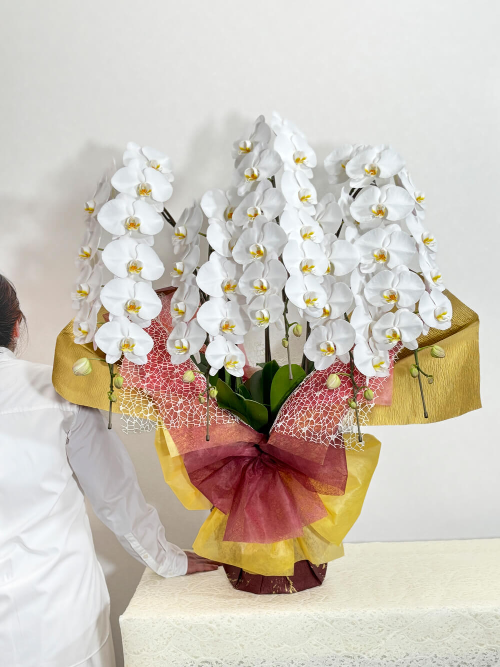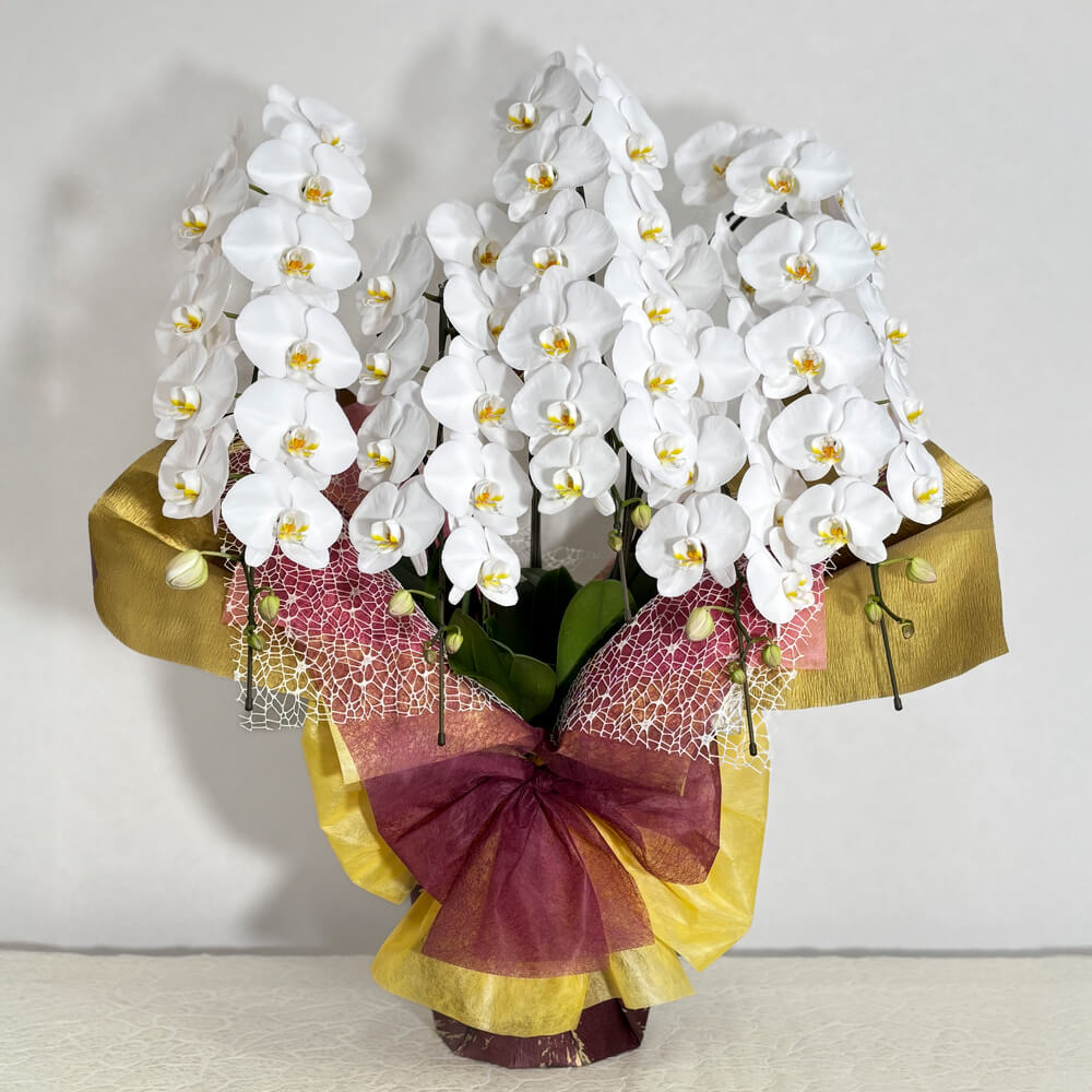 岡山市の花屋「ブルーメンノイエ」がお届けする、豪華な5本立ちの白胡蝶蘭です。堂々としたボリュームと純白の美しさが際立ち、開店祝いや就任祝い、法人ギフトなど格式あるシーンに最適。上品なラッピングで、より一層の高級感を演出します。贈る相手に特別な印象を残す、華やかで気品ある逸品です。