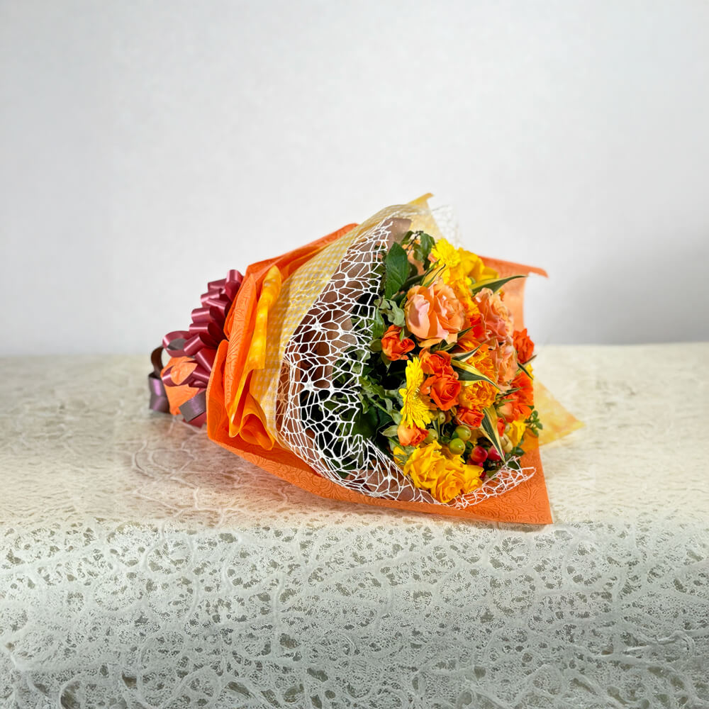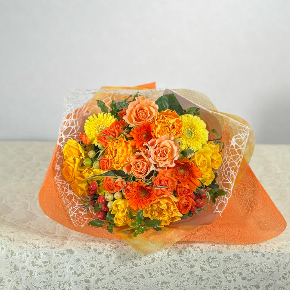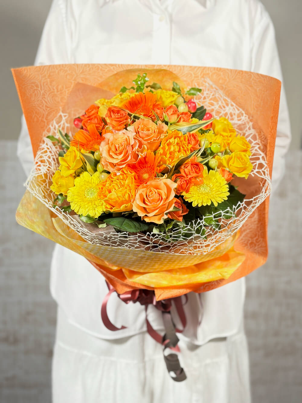 岡山市の花屋「ブルーメンノイエ」がお届けする、オレンジのばらを中心に束ねた華やかな花束です。温かみのあるオレンジ色が、元気や励ましの気持ちを伝える贈り物にぴったり。季節ごとに旬の生花を使用するため、掲載写真と実際の花材が異なる場合がございますが、その時ならではの美しさをお楽しみいただけます。