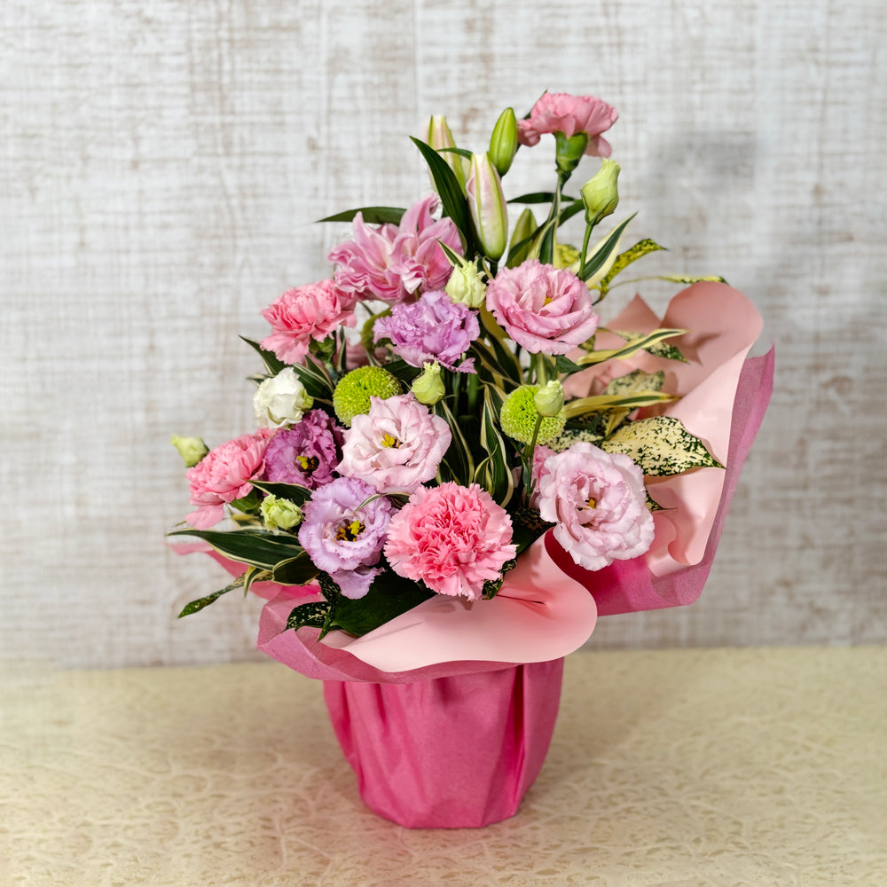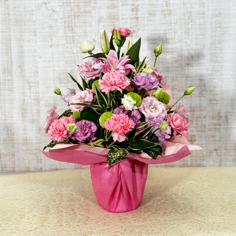 岡山市の花屋「ブルーメンノイエ」がお届けする、優しいピンク系のフラワーアレンジメントです。華やかでありながらも落ち着いた印象で、お祝いはもちろん、お供えのシーンにもふさわしいデザインです。贈る相手の心にそっと寄り添う、上品で気持ちのこもった一品です。生花を使用しているため、季節により写真と異なる花材になる場合がございます。