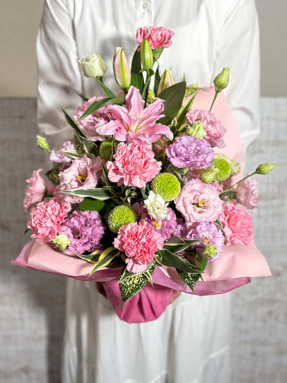 - 使用する花は、季節により発色や大きさが写真と異なる場合がございます。また、天候や仕入れの状況により変更する場合もありますが、ボリューム感や雰囲気は掲載写真にそうよう配慮いたします。花の仕入れは制作・発送の直前に決定するため、花の内容変更について事前にご連絡をすることが難しい場合があることを予めご了承ください。