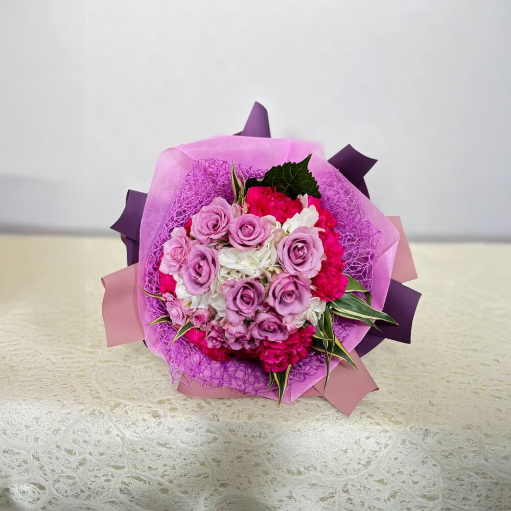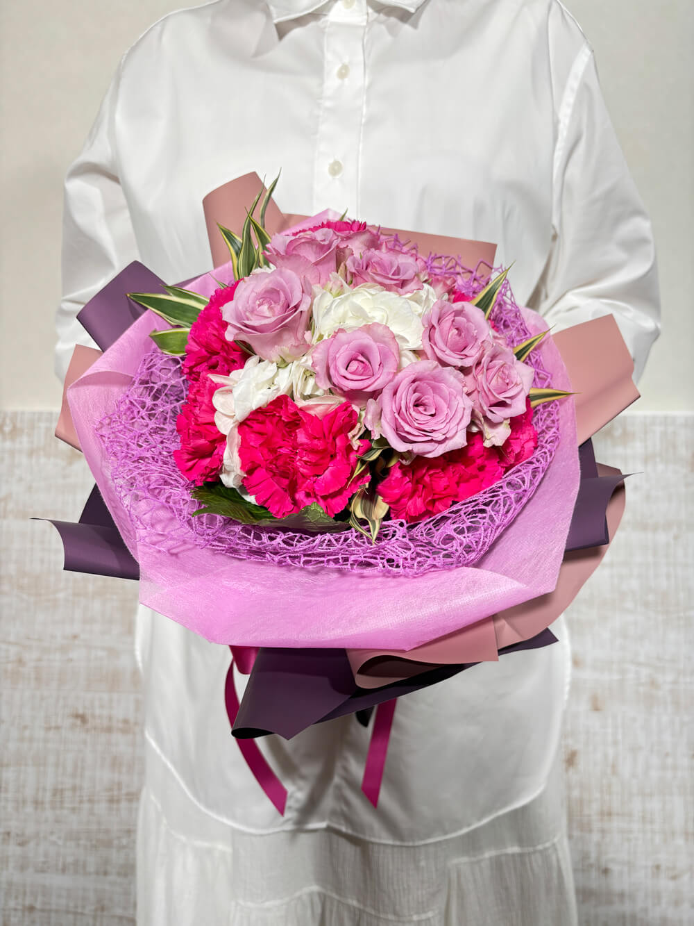 岡山市の花屋「ブルーメンノイエ」がお届けする、華やかなピンク系の花束です。やわらかな雰囲気の中に気品を感じさせる色合いが、誕生日や記念日、お祝いのギフトにぴったり。贈る相手に明るく優しい気持ちを届けます。生花を使用しているため、季節により写真と異なる花材になる場合がございます。