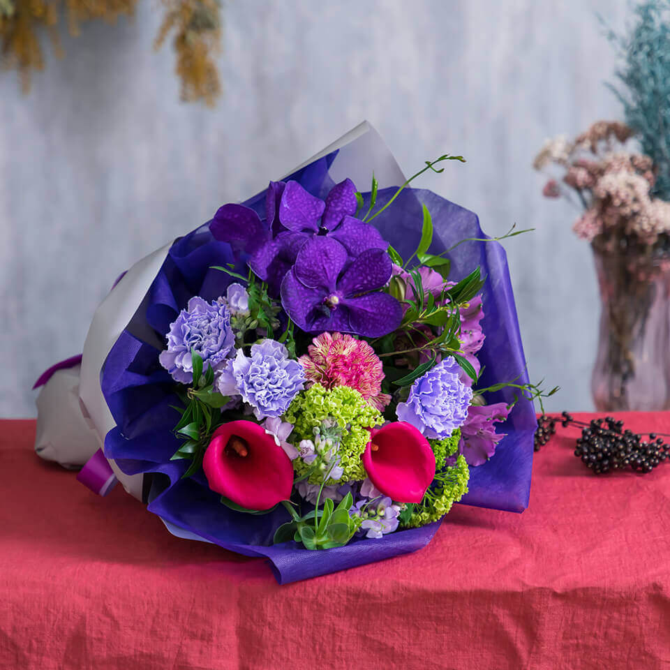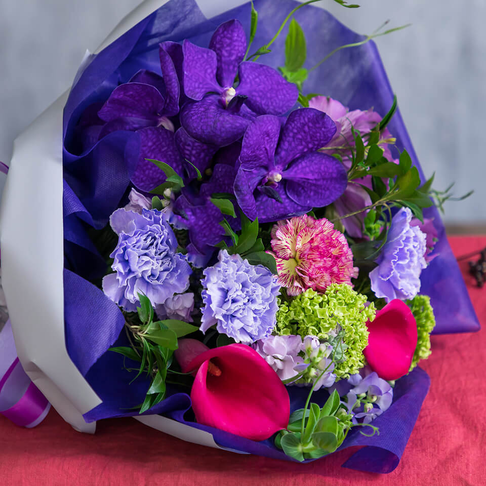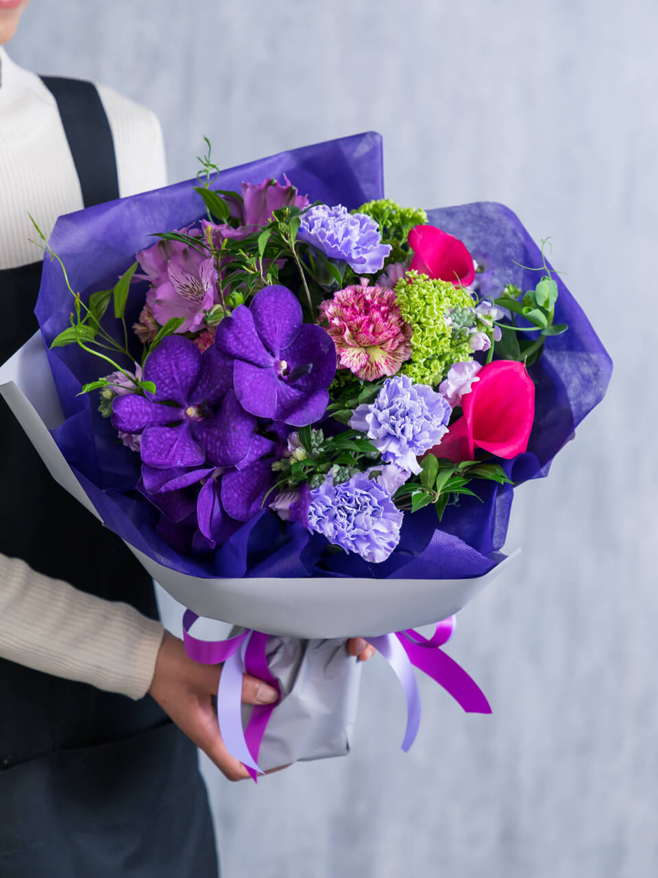 岡山市の花屋「ブルーメンノイエ」が心を込めてお作りする、紫ブルー系の花束です。爽やかで上品な色合いが、特別な日の贈り物やお祝いにぴったり。季節ごとの旬の生花を使い、その時期ならではの美しさをお届けします。そのため、掲載写真と実際の花材が異なる場合がございます。どうぞ世界にひとつだけの花束をお楽しみください。