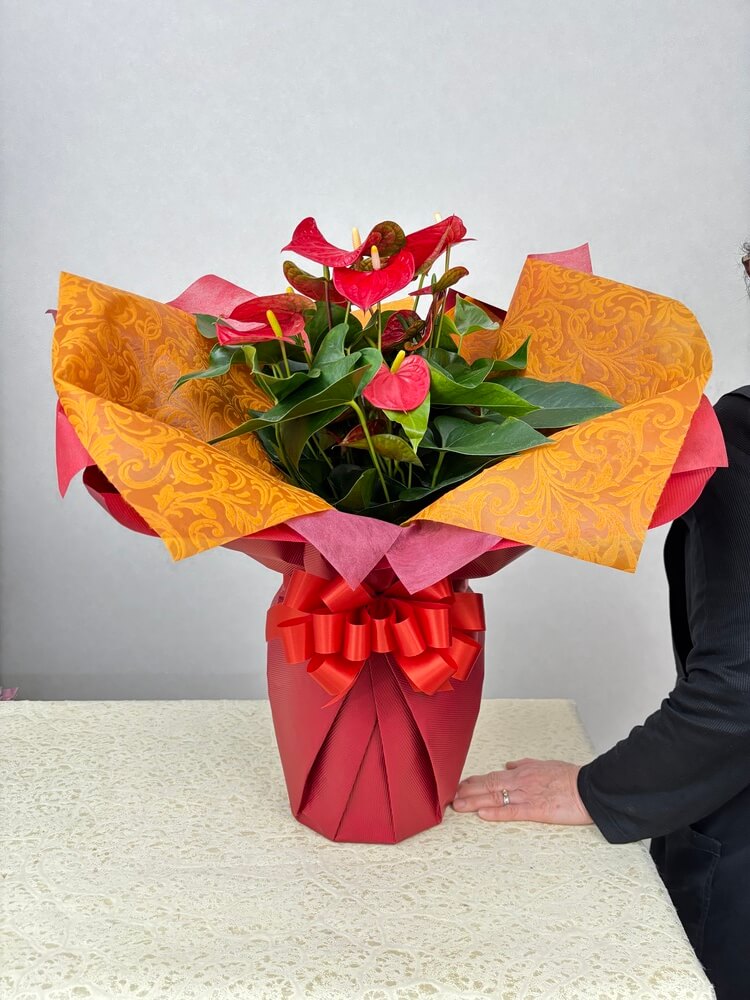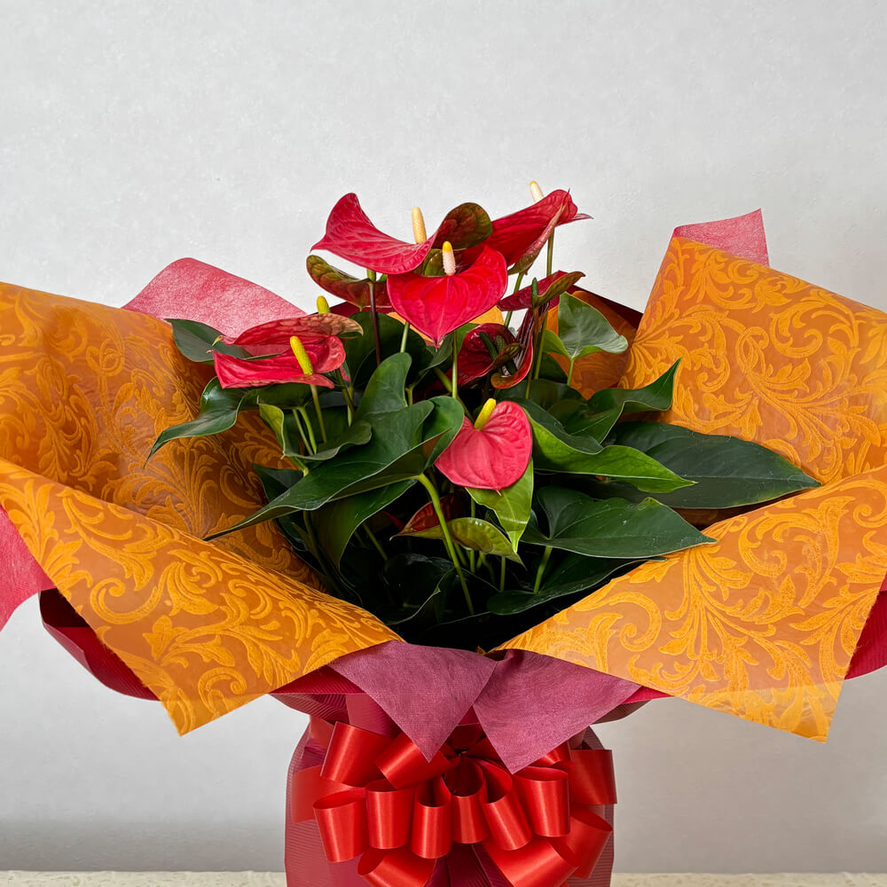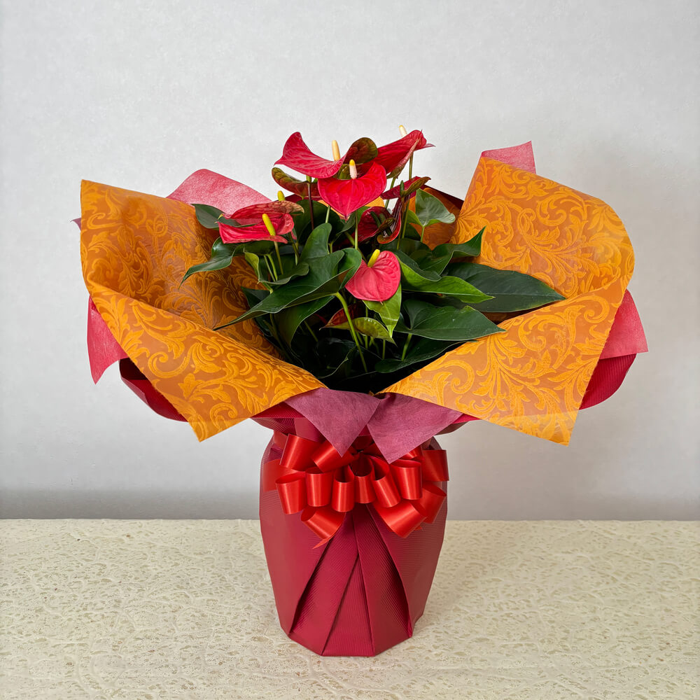 岡山市の花屋・ブルーメンノイエが手がける、赤系アンスリュームを主役にした上品で落ち着いた雰囲気のお花のある観葉植物です。艶のある赤の花姿が空間を華やかに彩り、贈り物にもご自宅用にもおすすめです。