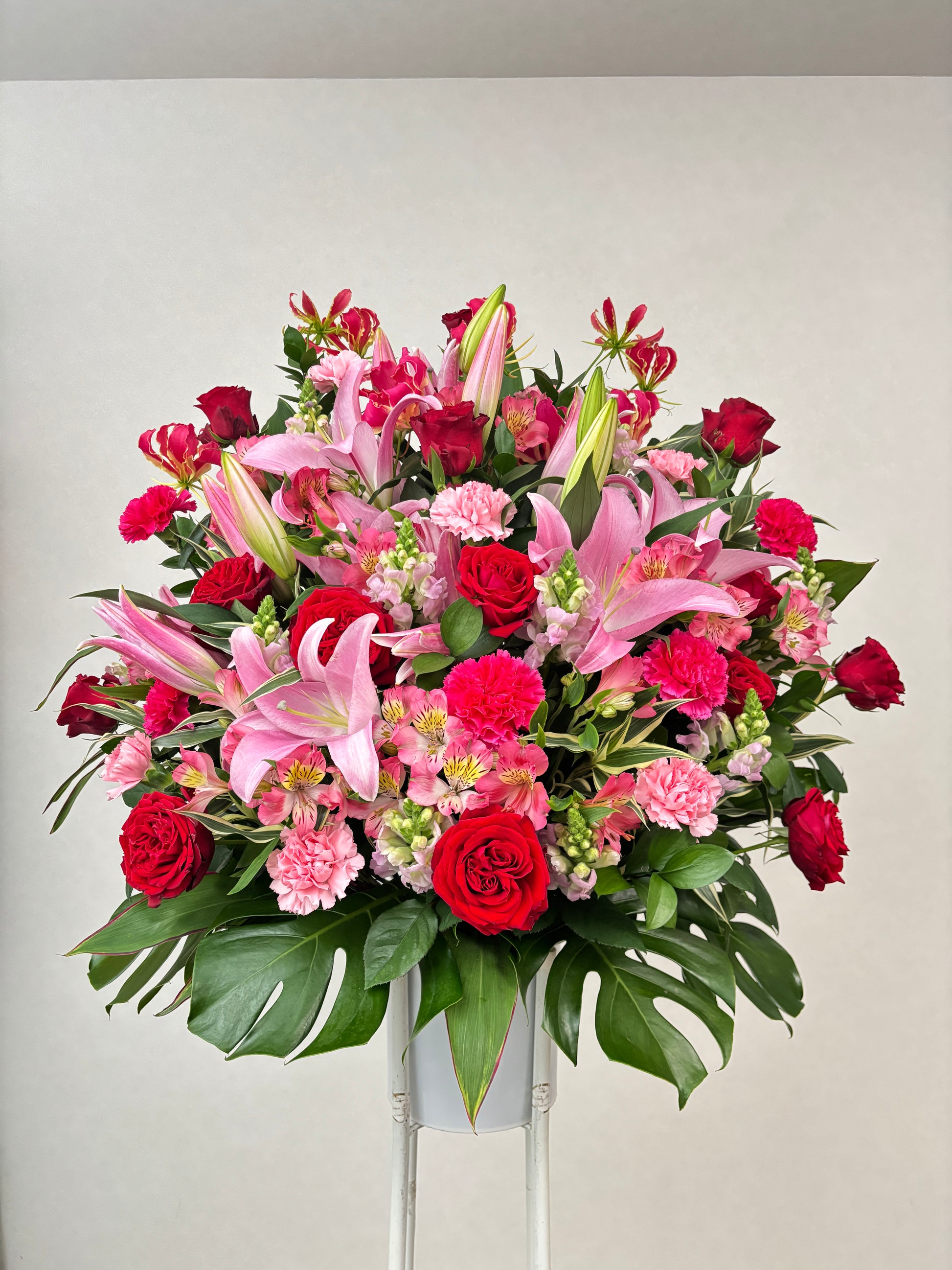 岡山市の花屋「ブルーメンノイエ」より、華やかさとボリューム感を兼ね備えた季節のおまかせスタンド花をご提供します。彩り豊かな花々をふんだんに使用し、開店祝いや公演祝い、各種イベントの装飾に最適な存在感のある一品です。使用する生花は季節によって異なるため、写真と異なる内容になる場合がございます。ご了承ください。