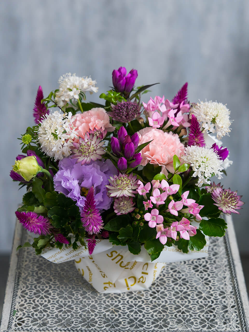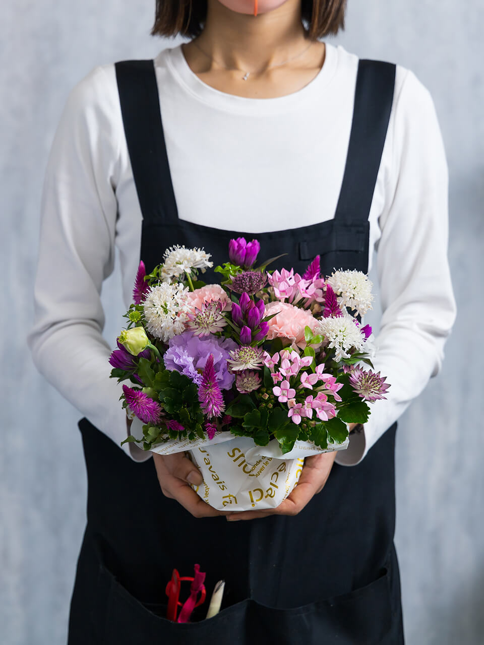 - 使用する花は、季節により発色や大きさが写真と異なる場合がございます。また、天候や仕入れの状況により変更する場合もありますが、ボリューム感や雰囲気は掲載写真にそうよう配慮いたします。花の仕入れは制作・発送の直前に決定するため、花の内容変更について事前にご連絡をすることが難しい場合があることを予めご了承ください。
