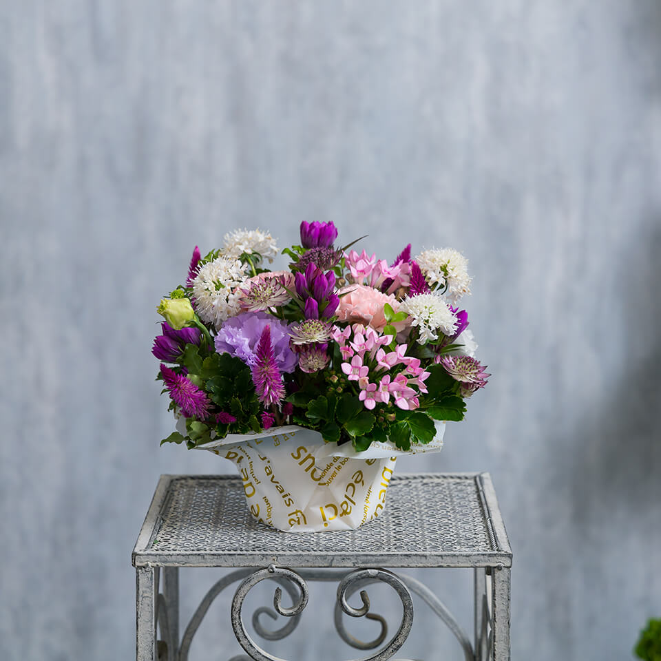岡山市の花屋「ブルーメンノイエ」が、旬の花々をセレクトしてお作りする季節のお任せアレンジメントです。大切な方への贈り物や自宅用にもおすすめ。花材は季節ごとに異なり、その時期に最も美しい花を使用します。写真は一例となり、実際の花材は季節によって変更となります。