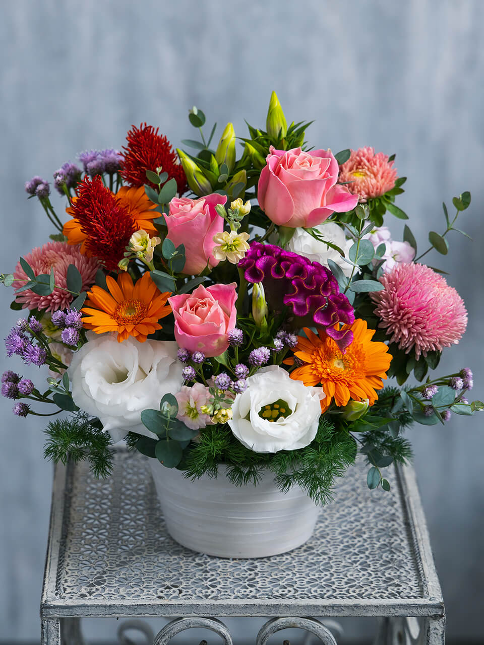 岡山市の花屋「ブルーメンノイエ」が、旬の花々をセレクトしてお作りする季節のお任せアレンジメントです。大切な方への贈り物や自宅用にもおすすめ。花材は季節ごとに異なり、その時期に最も美しい花を使用します。写真は一例となり、実際の花材は季節によって変更となります。