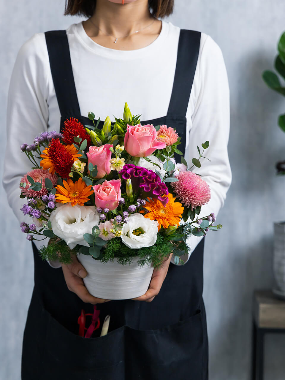 - 使用する花は、季節により発色や大きさが写真と異なる場合がございます。また、天候や仕入れの状況により変更する場合もありますが、ボリューム感や雰囲気は掲載写真にそうよう配慮いたします。花の仕入れは制作・発送の直前に決定するため、花の内容変更について事前にご連絡をすることが難しい場合があることを予めご了承ください。