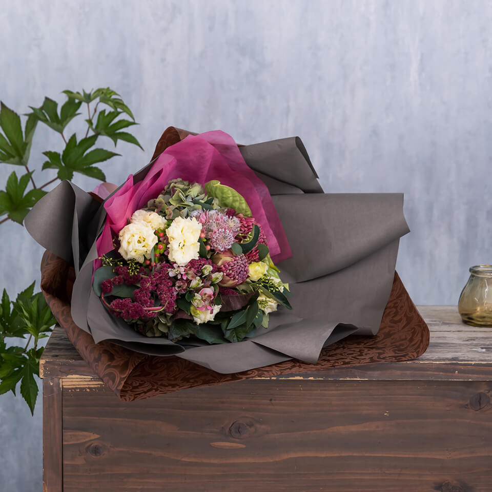 岡山市の花屋「ブルーメンノイエ」が、旬の花々をセレクトしてお作りする季節のお任せ花束です。大切な方への贈り物や自宅用にもおすすめ。花材は季節ごとに異なり、その時期に最も美しい花を使用します。写真は一例となり、実際の花材は季節によって変更となります。