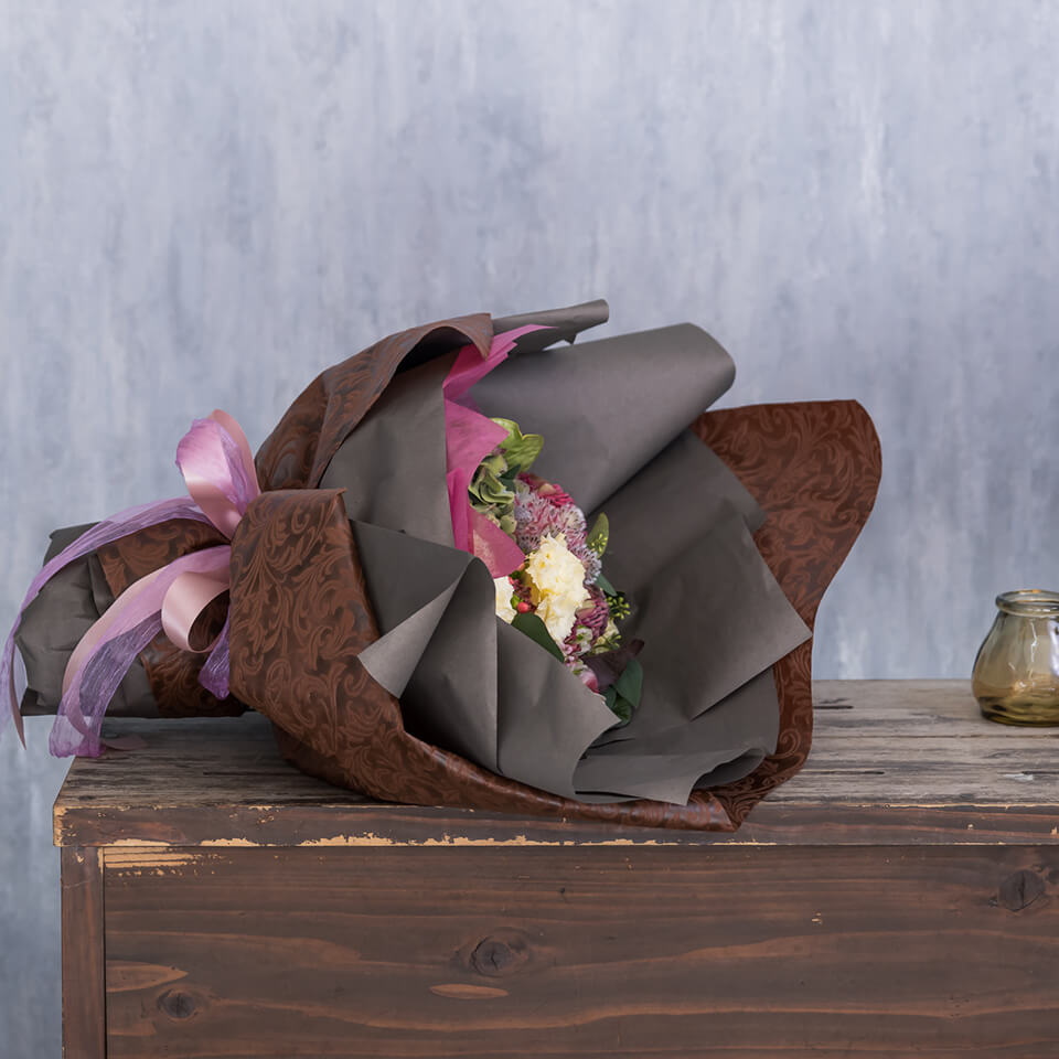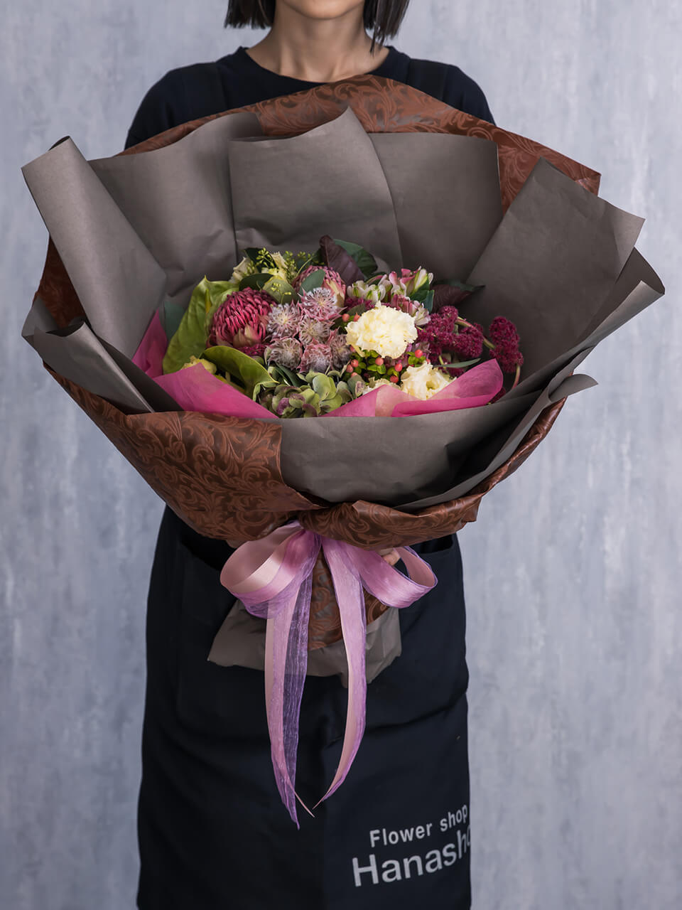 - 使用する花は、季節により発色や大きさが写真と異なる場合がございます。また、天候や仕入れの状況により変更する場合もありますが、ボリューム感や雰囲気は掲載写真にそうよう配慮いたします。花の仕入れは制作・発送の直前に決定するため、花の内容変更について事前にご連絡をすることが難しい場合があることを予めご了承ください。