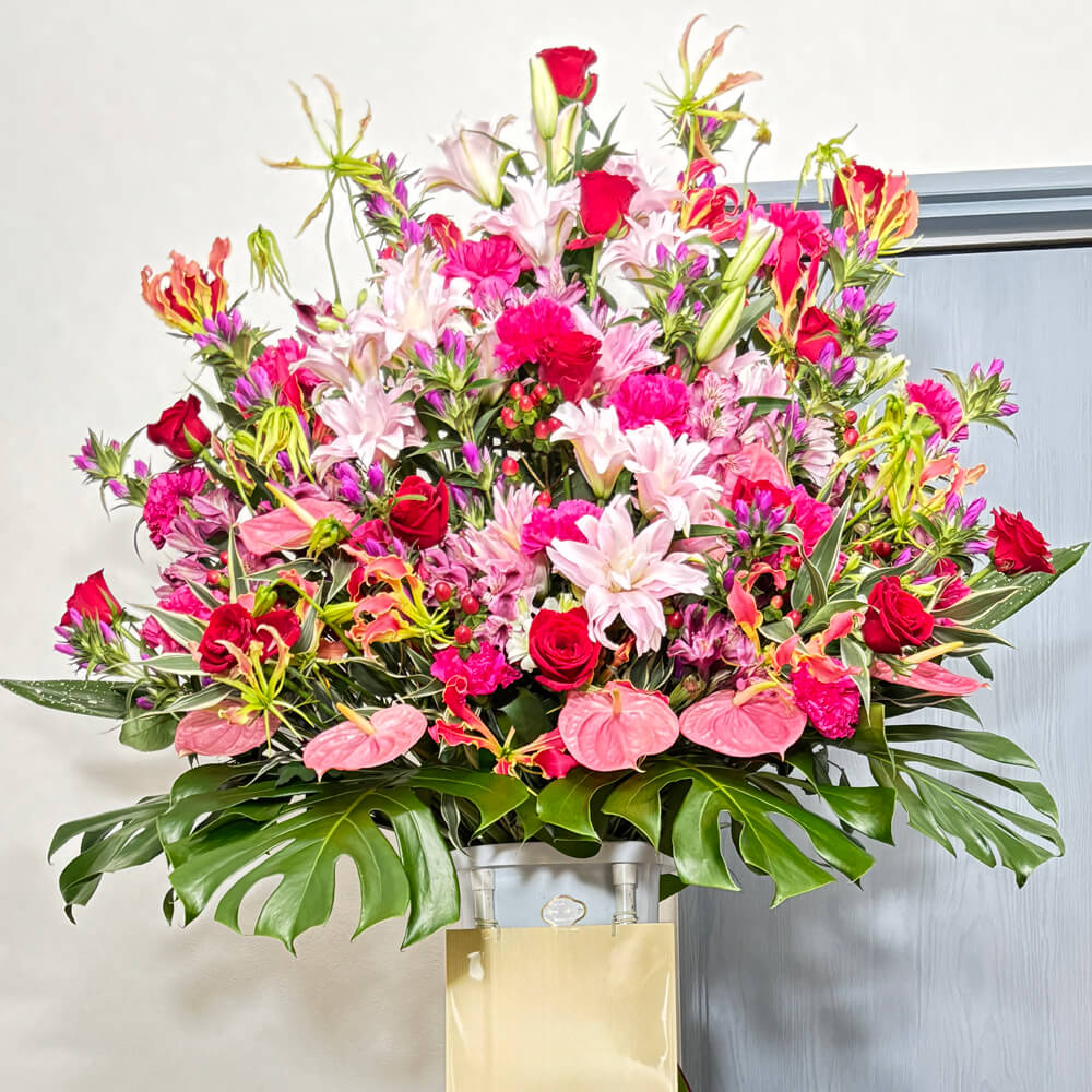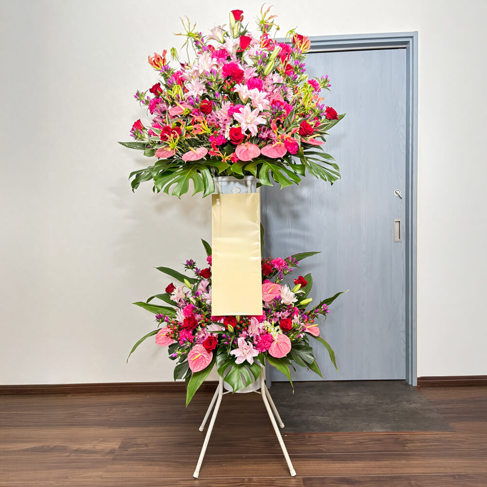岡山市の花屋「ブルーメンノイエ」がお届けする、季節の花材を使用したおまかせ2段スタンド花です。豊かなボリュームと華やかな彩りで、開店祝いや公演祝い、各種式典などのシーンに最適。季節感を大切にしたデザインで、贈る想いを美しく表現します。生花を使用しているため、写真と異なる花材になる場合がございます。