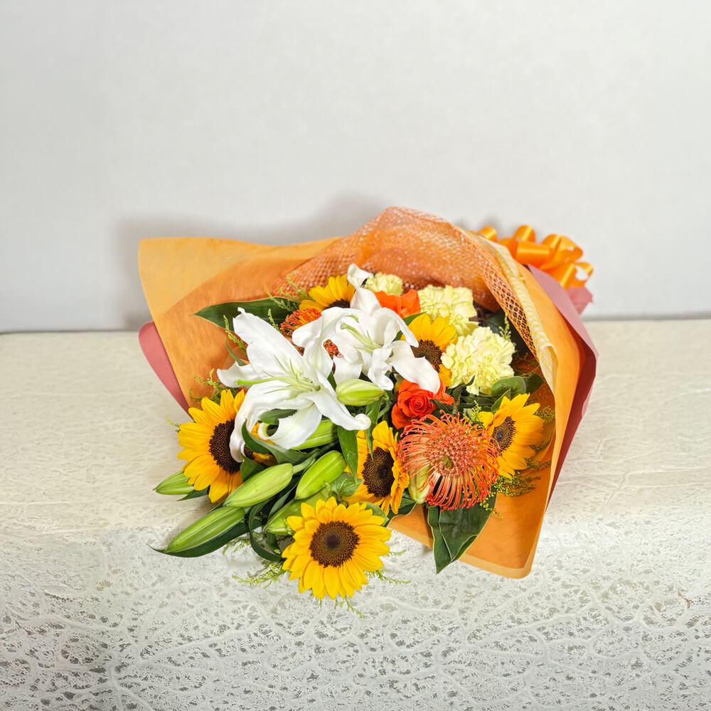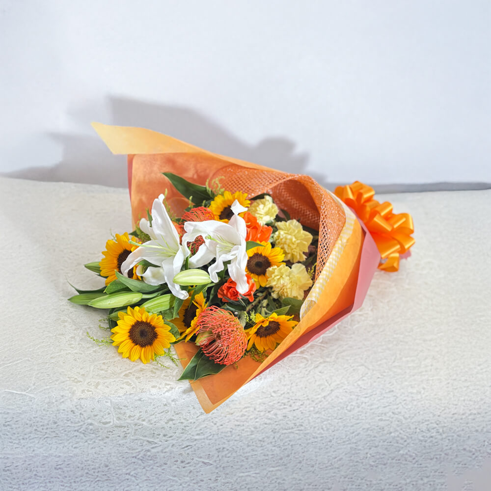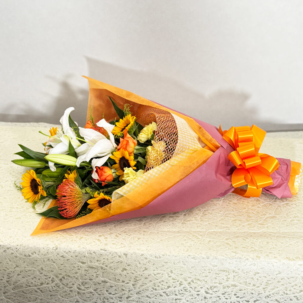 岡山市の花屋「ブルーメンノイエ」がお届けする、ひまわりを主役にした華やかな花束(5,500円)です。明るく元気な印象の花々が、贈る方の想いをポジティブに伝えます。誕生日や送別、季節のギフトとしておすすめの一品です。生花を使用しているため、季節により写真と異なる花材になる場合がございます。