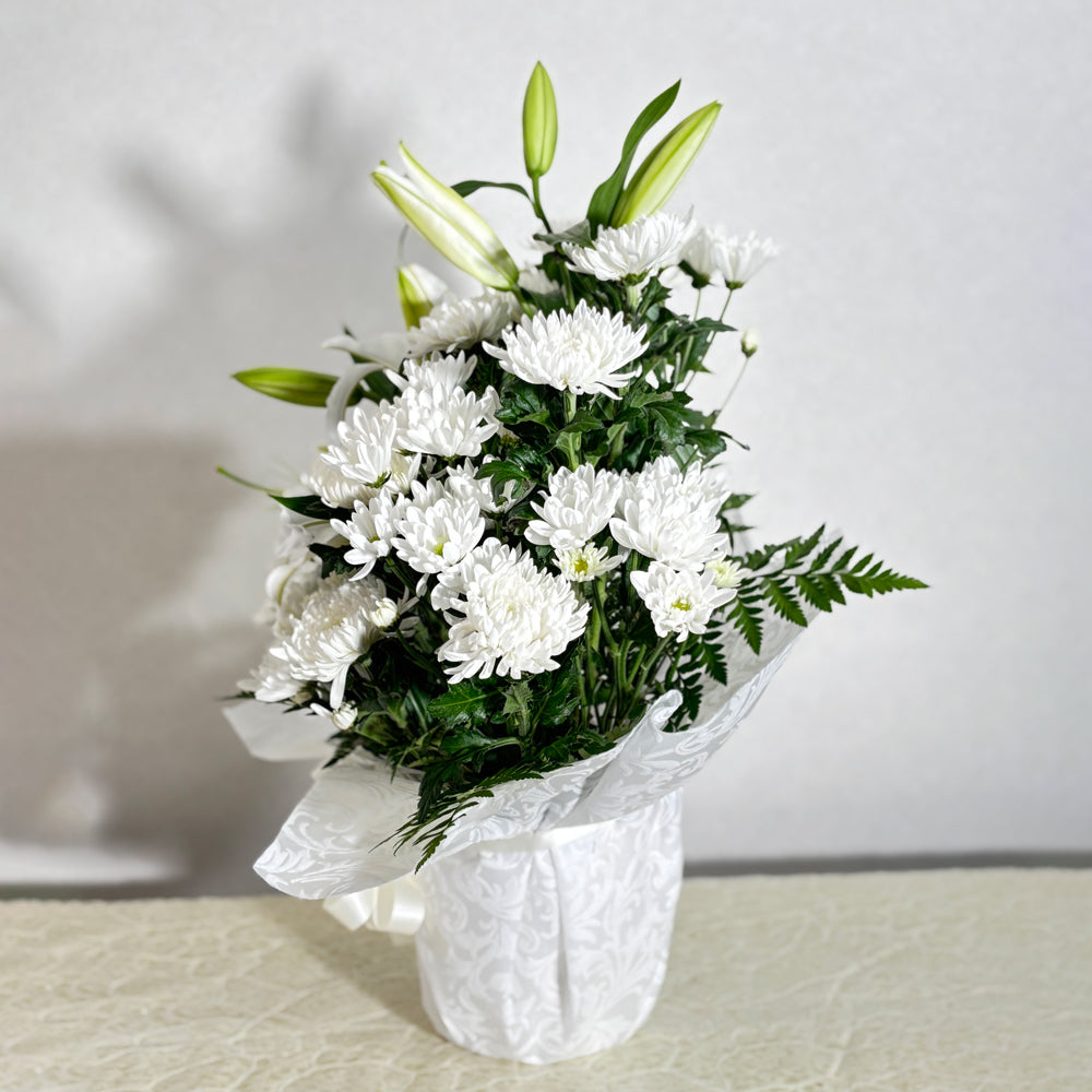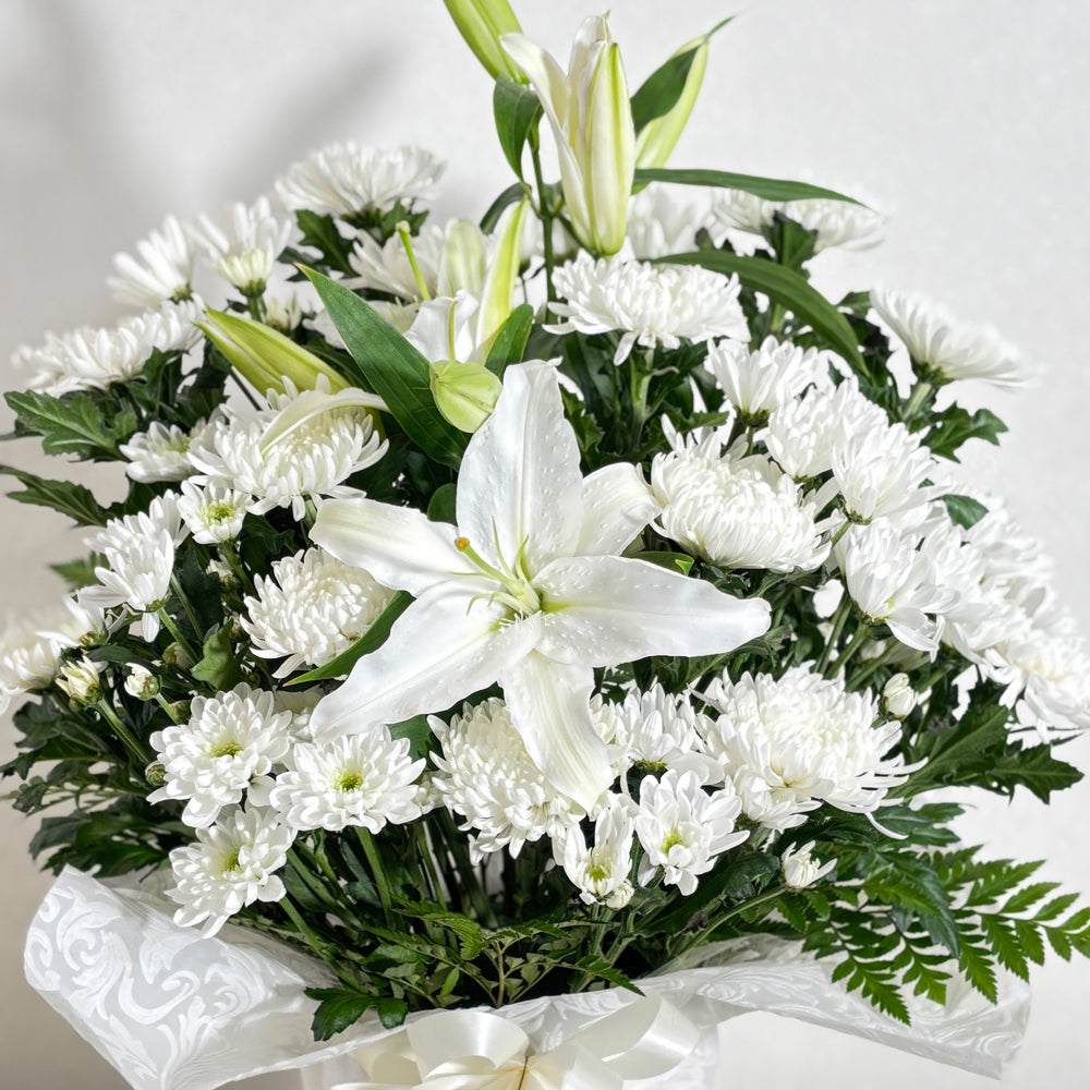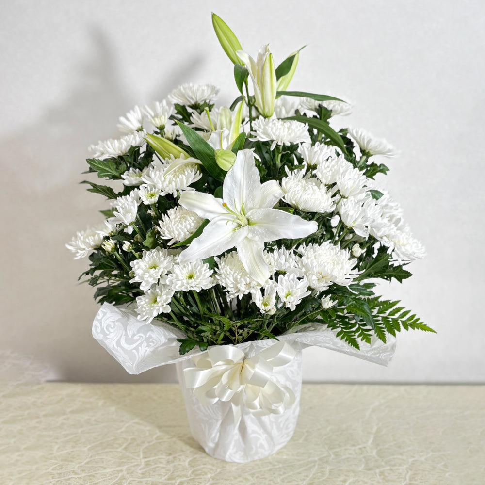 岡山市の花屋「ブルーメンノイエ」がお届けする、白を基調とした上品なお供え用アレンジメントです。格調高い花々が静かに咲き誇り、故人への敬意と感謝の想いを丁寧に表現します。法要やご命日など、大切な節目の贈り物としておすすめです。生花を使用しているため、季節により写真と異なる花材になる場合がございます。
