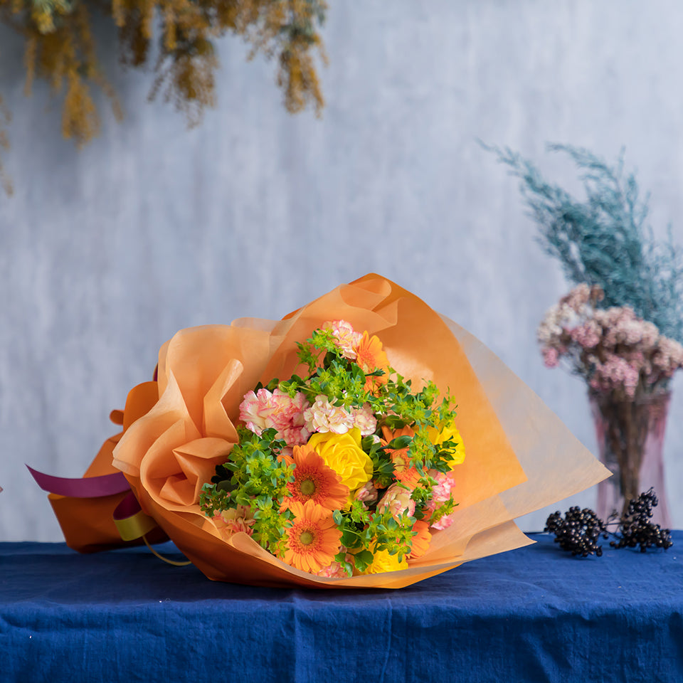 明るく元気な印象の黄色・オレンジ系でまとめた、気持ちが前向きになる花束です。お誕生日やお祝い、感謝の贈り物など、さまざまなシーンにおすすめ。空間をぱっと華やかに彩ります。岡山市の花屋「ブルーメンノイエ」が、心を込めて丁寧にお作りします。