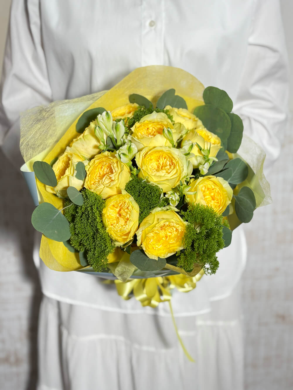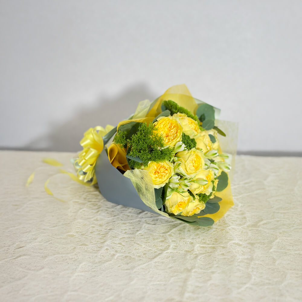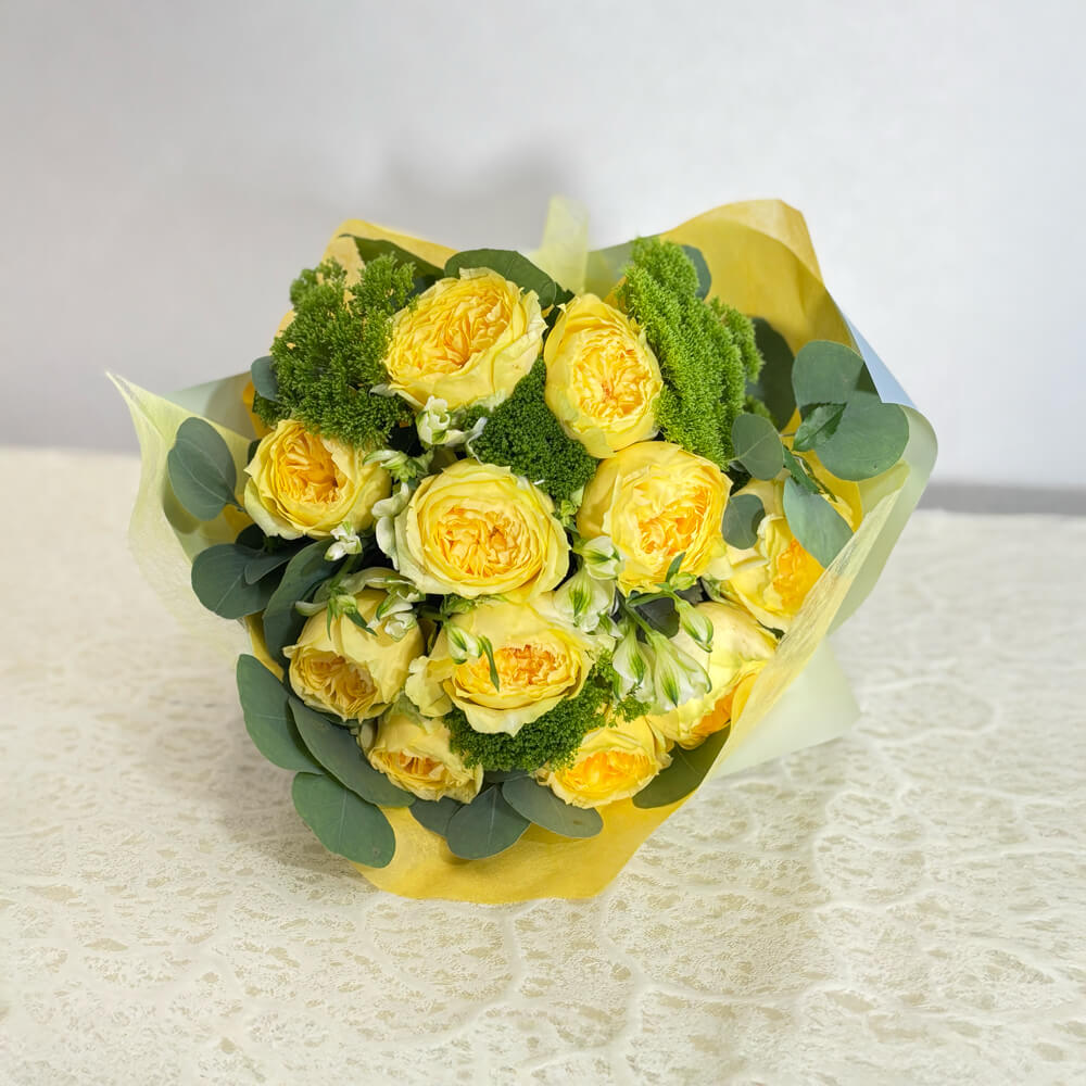 岡山市の花屋「ブルーメンノイエ」がお届けする、黄色のばらをメインにした華やかな花束です。明るく元気な印象の黄色が、感謝やお祝いの気持ちを伝える贈り物にぴったり。季節に合わせた旬の生花を使用しているため、掲載写真と実際の花材が異なる場合がございますが、その時期ならではの彩りをお楽しみいただけます。